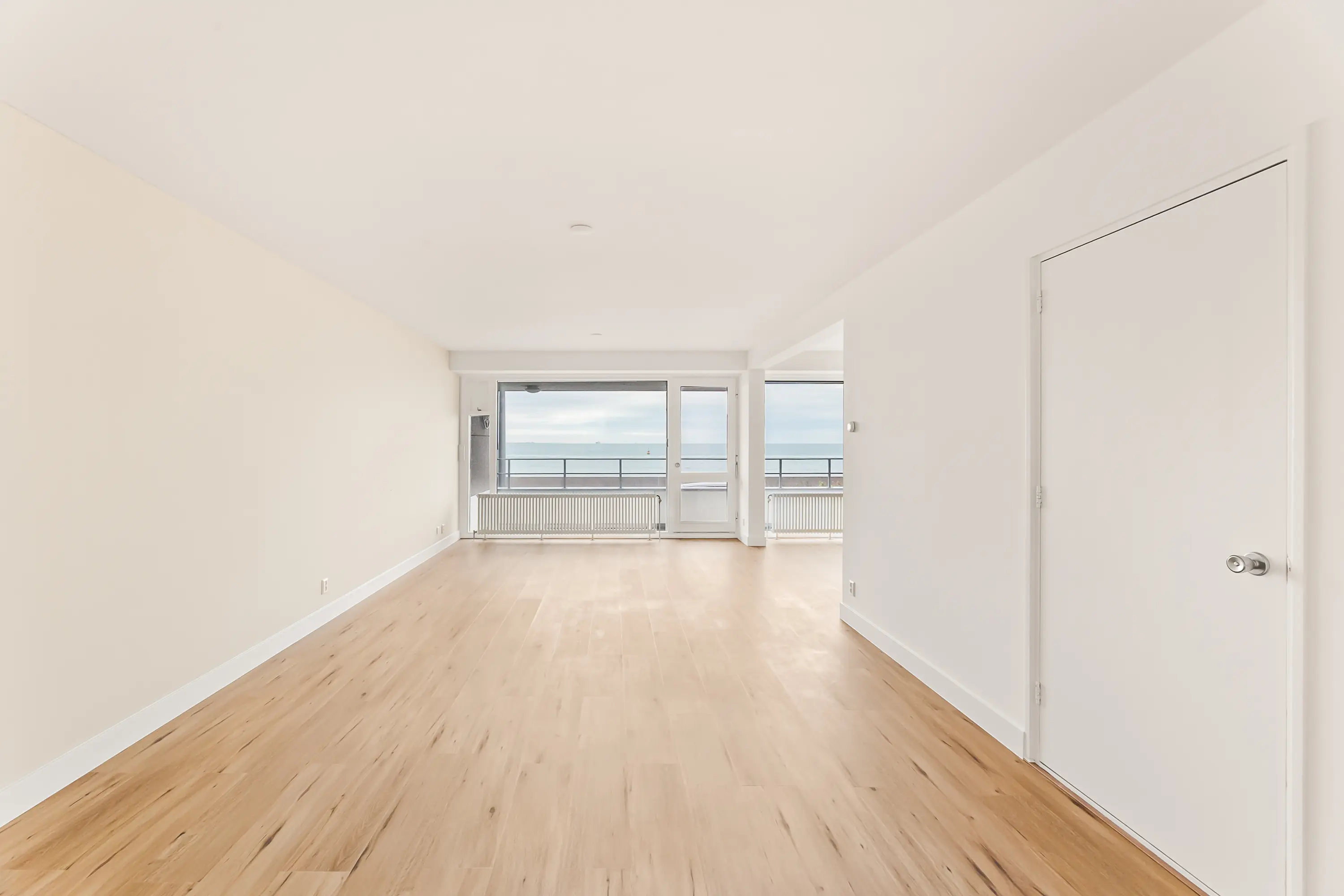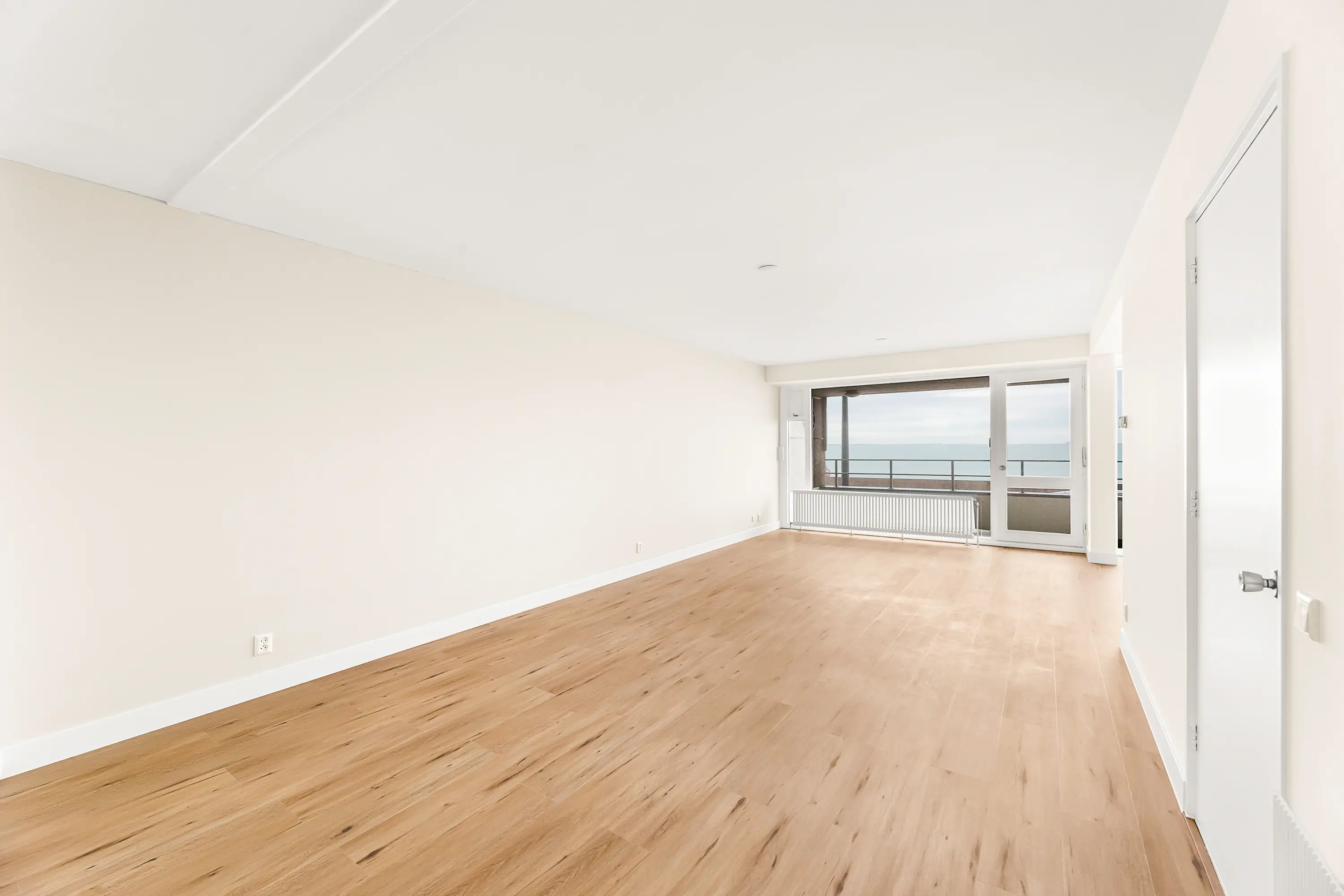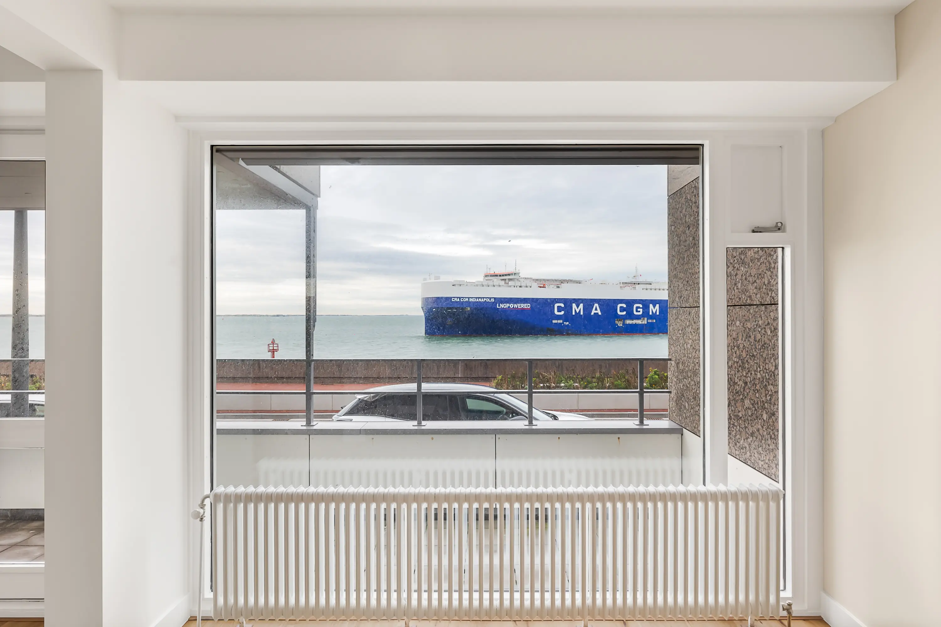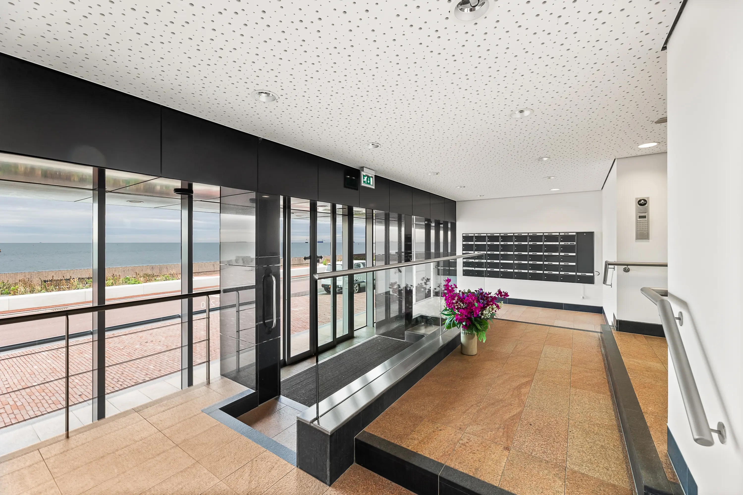 Entree van het appartement, hal met de kast met opstelling van de c.v.-combiketel. Dit appartement is voorzien van een royale woonkamer. Het magnifieke uitzicht vanuit de woonkamer reikt tot aan de Zeeuws Vlaamse kust. Er is een prettig overdekt balkon over de hele breedte van het appartement. De open keuken is luxe uitgevoerd en voorzien van inbouwapparatuur. De tweede hal biedt ruimte aan een slaap- of werkkamer aan de koele achterzijde en het vernieuwde toilet.