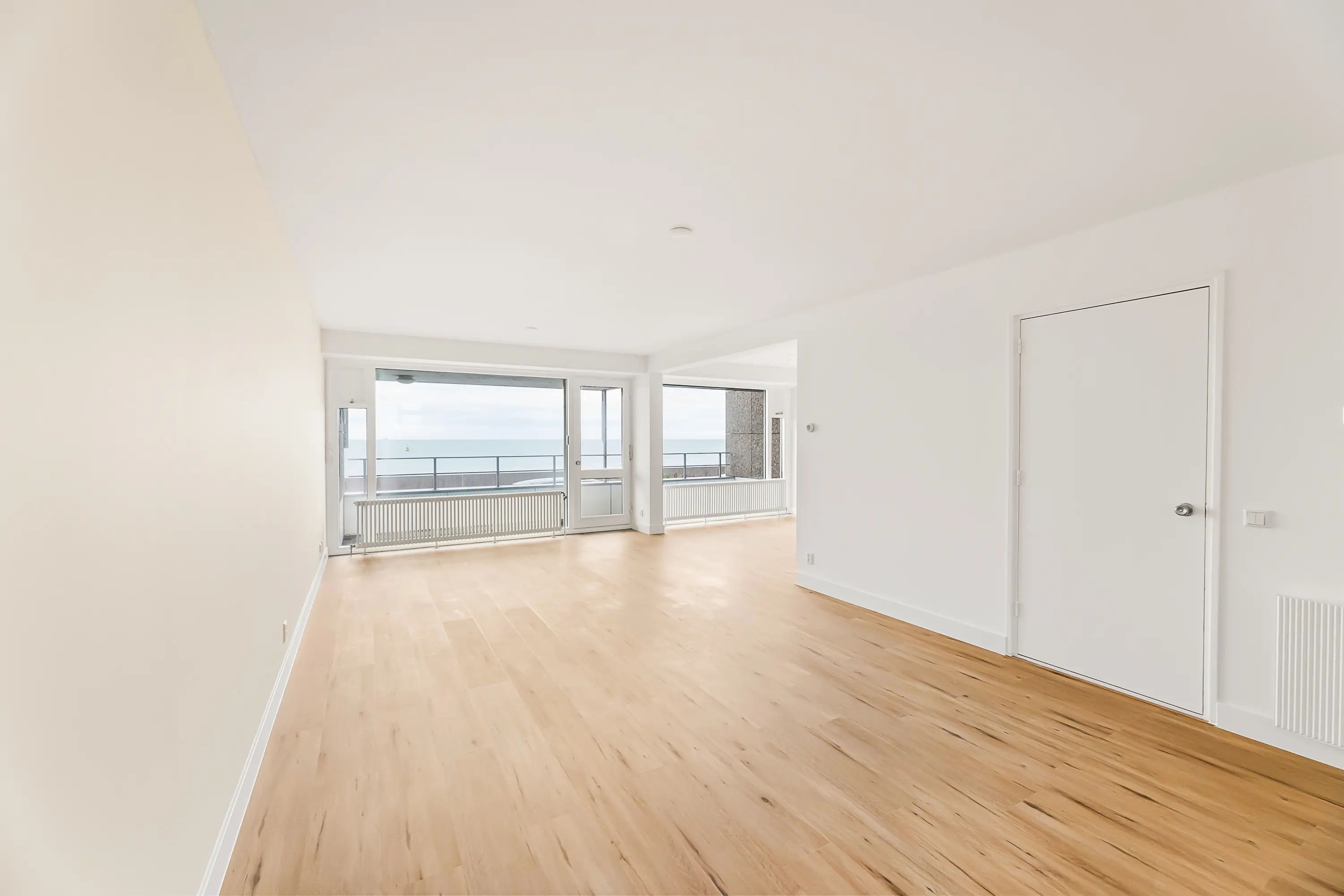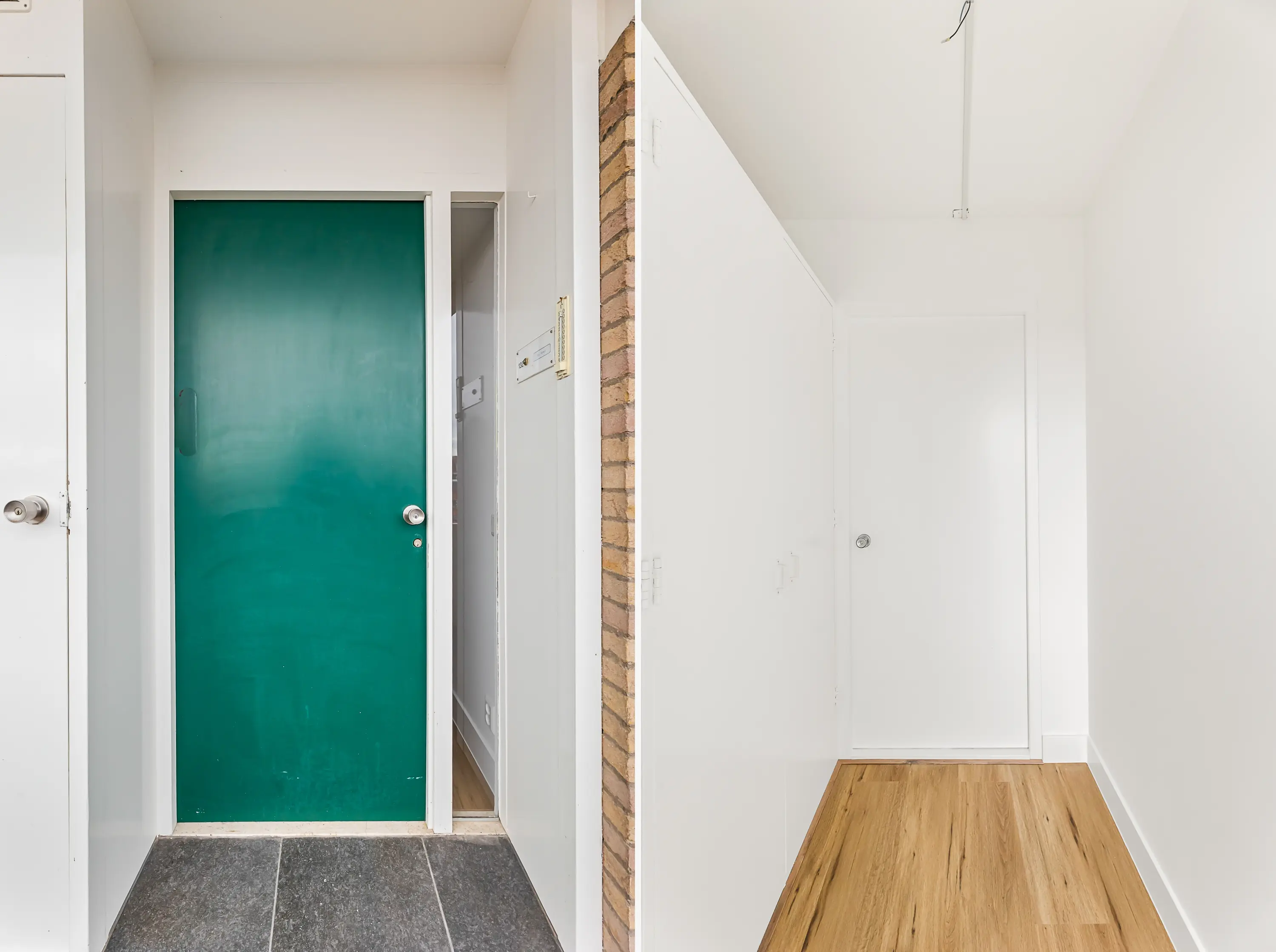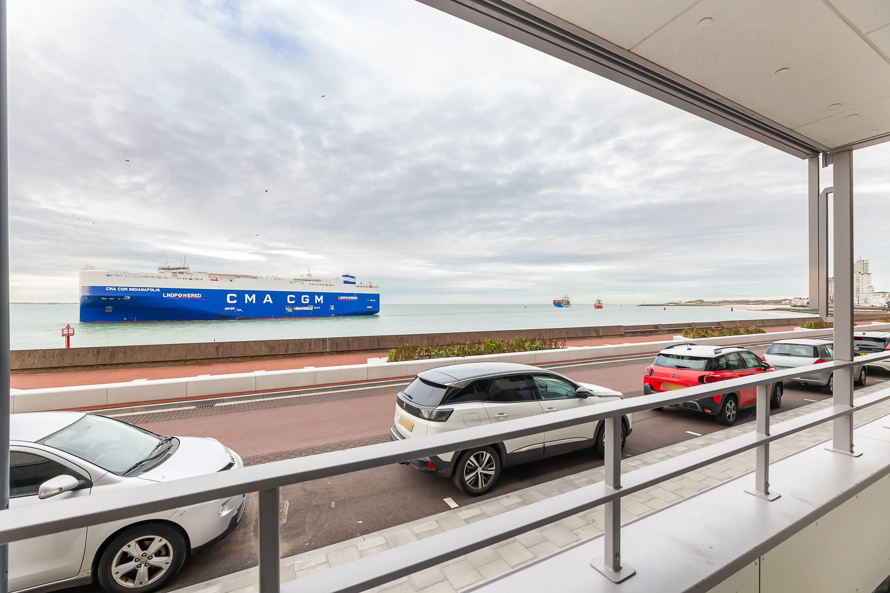 Entree van het appartement, hal met de kast met opstelling van de c.v.-combiketel. Dit appartement is voorzien van een royale woonkamer. Het magnifieke uitzicht vanuit de woonkamer reikt tot aan de Zeeuws Vlaamse kust. Er is een prettig overdekt balkon over de hele breedte van het appartement. De open keuken is luxe uitgevoerd en voorzien van inbouwapparatuur. De tweede hal biedt ruimte aan een slaap- of werkkamer aan de koele achterzijde en het vernieuwde toilet.