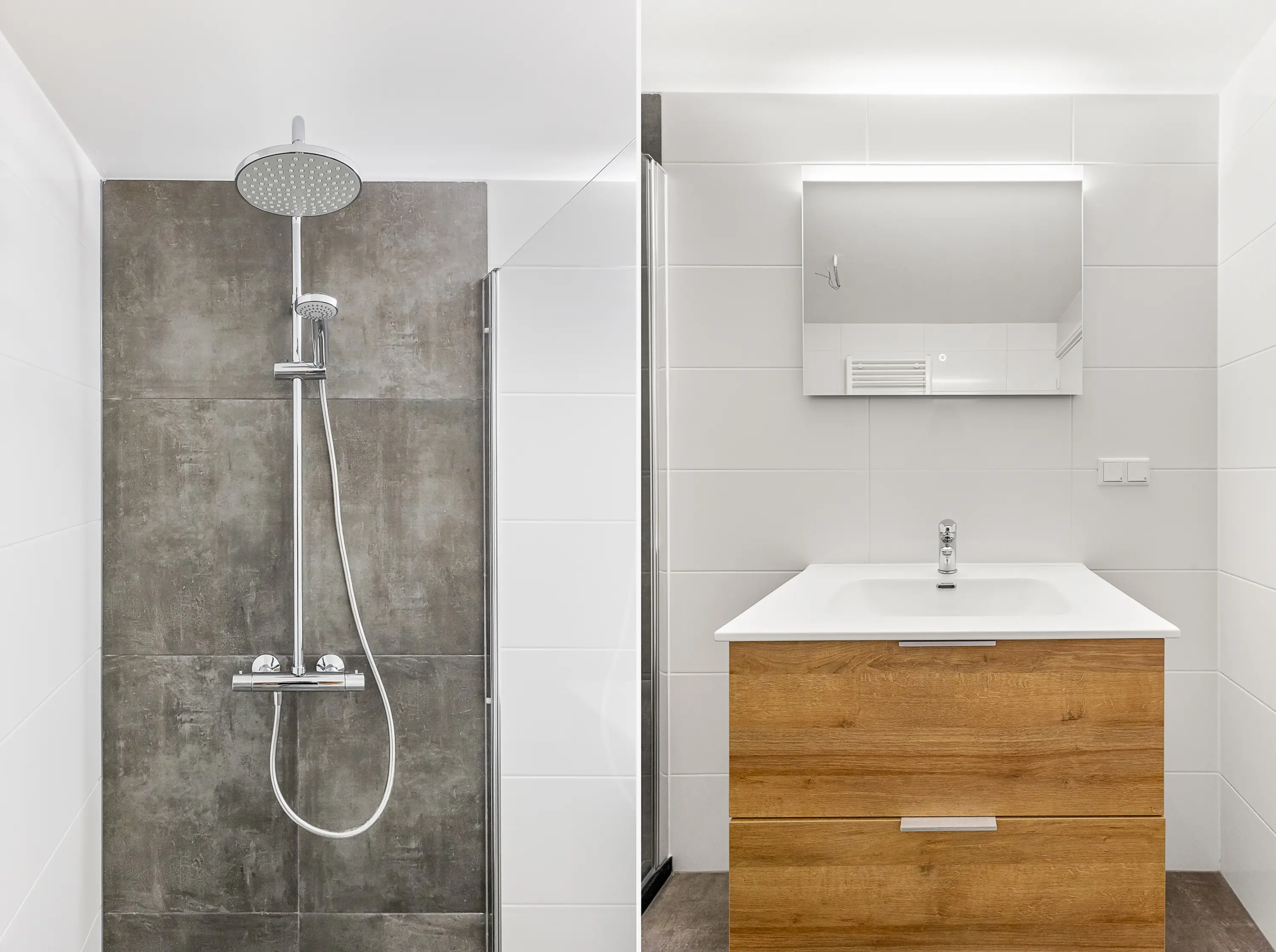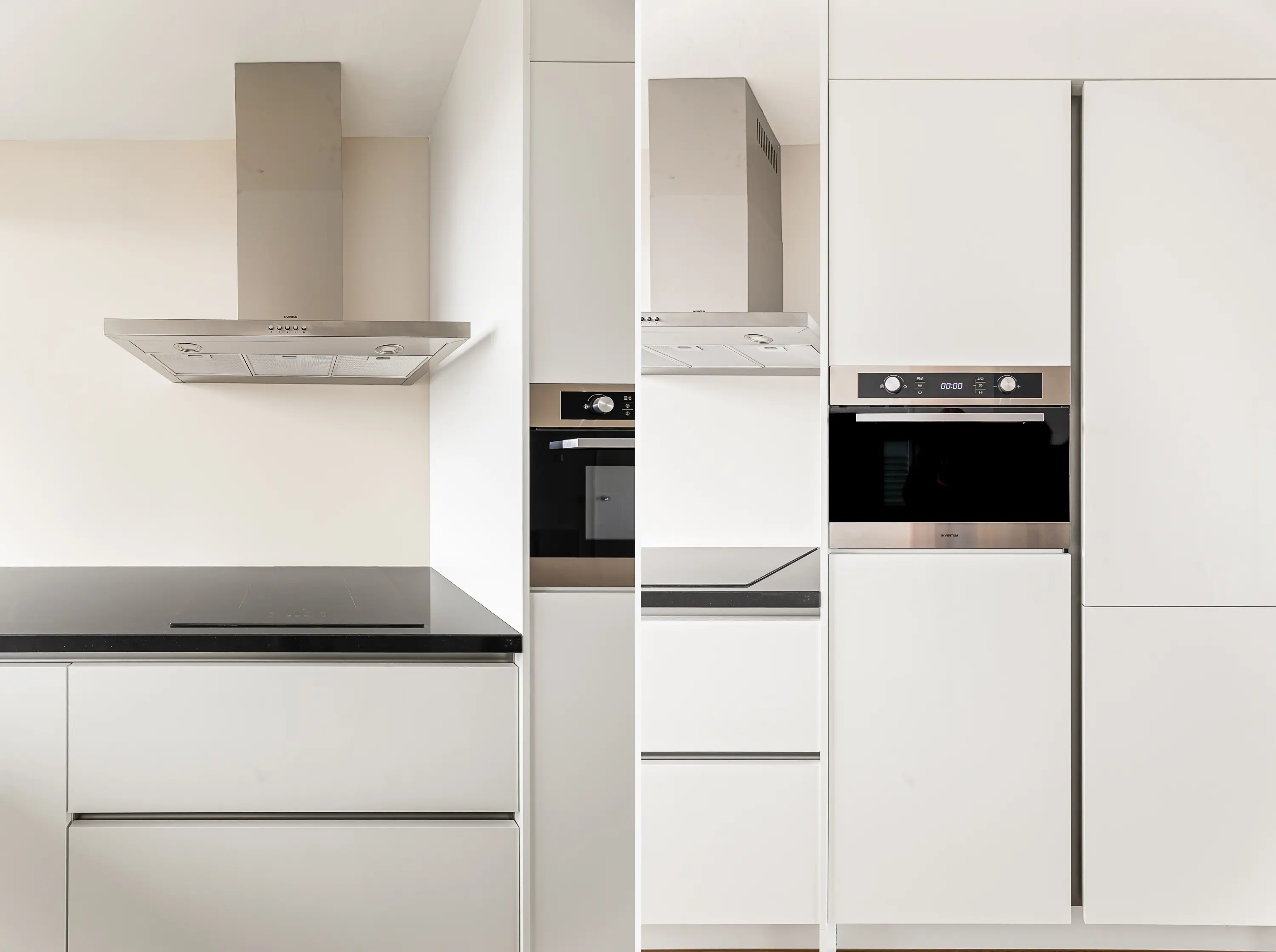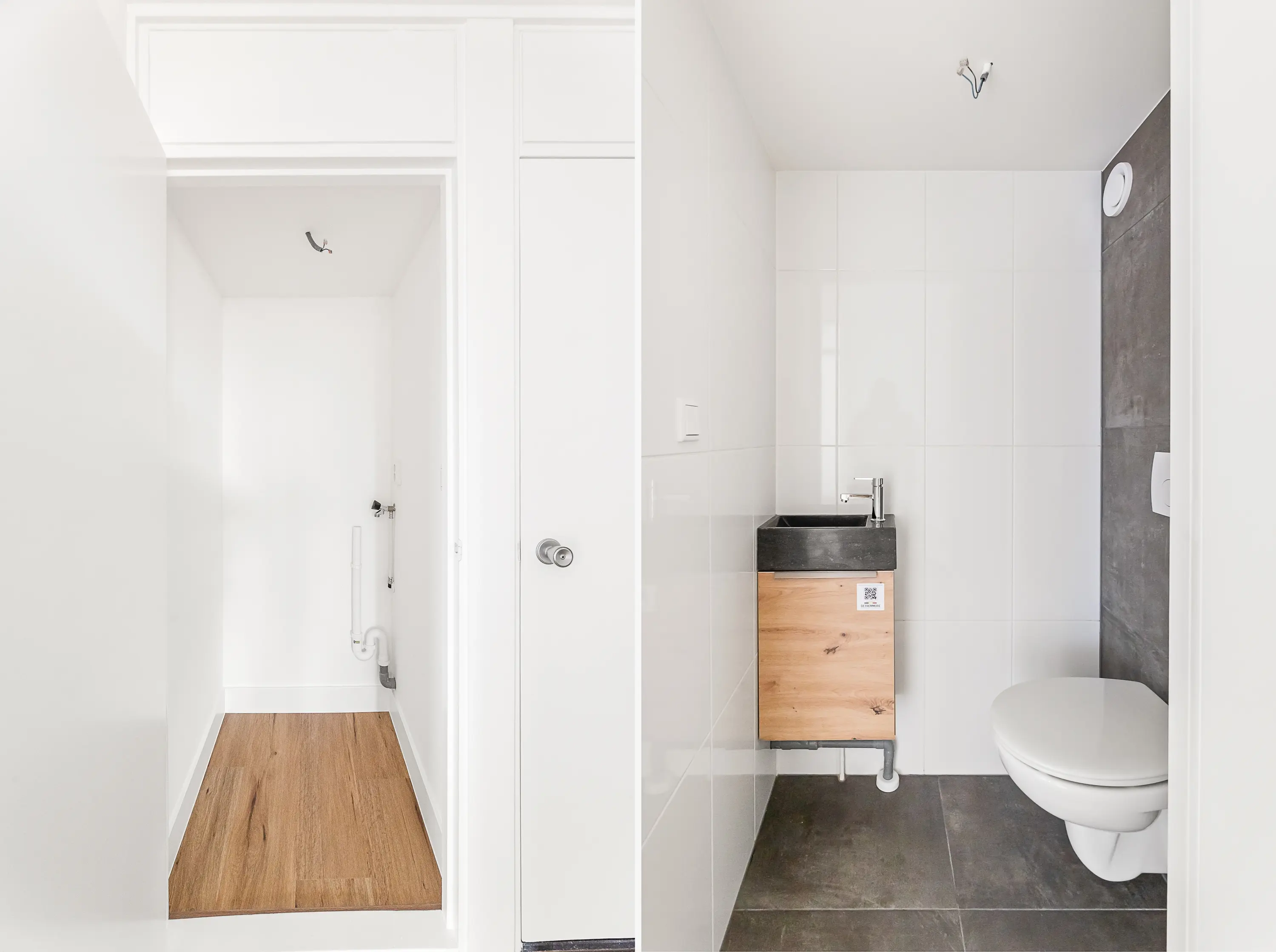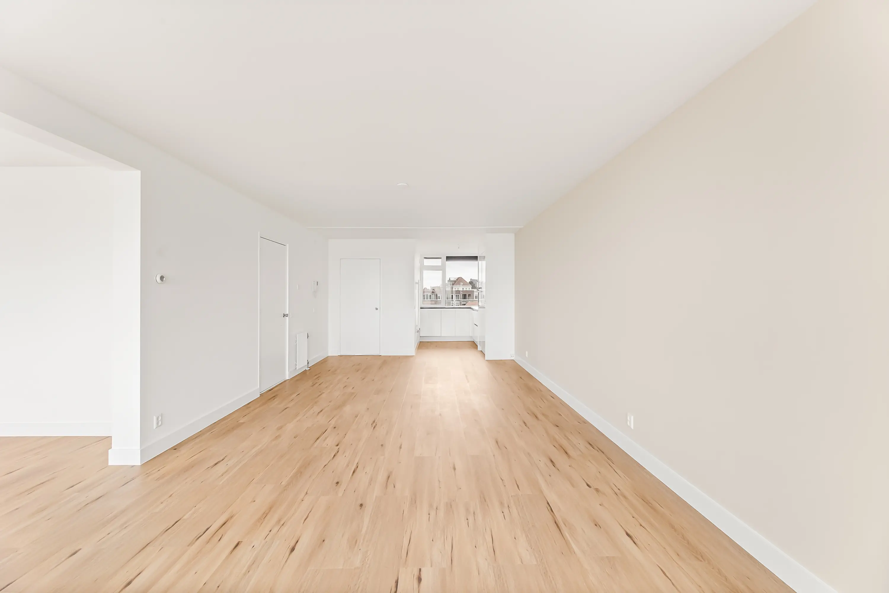 Entree van het appartement, hal met de kast met opstelling van de c.v.-combiketel. Dit appartement is voorzien van een royale woonkamer. Het magnifieke uitzicht vanuit de woonkamer reikt tot aan de Zeeuws Vlaamse kust. Er is een prettig overdekt balkon over de hele breedte van het appartement. De open keuken is luxe uitgevoerd en voorzien van inbouwapparatuur. De tweede hal biedt ruimte aan een slaap- of werkkamer aan de koele achterzijde en het vernieuwde toilet.