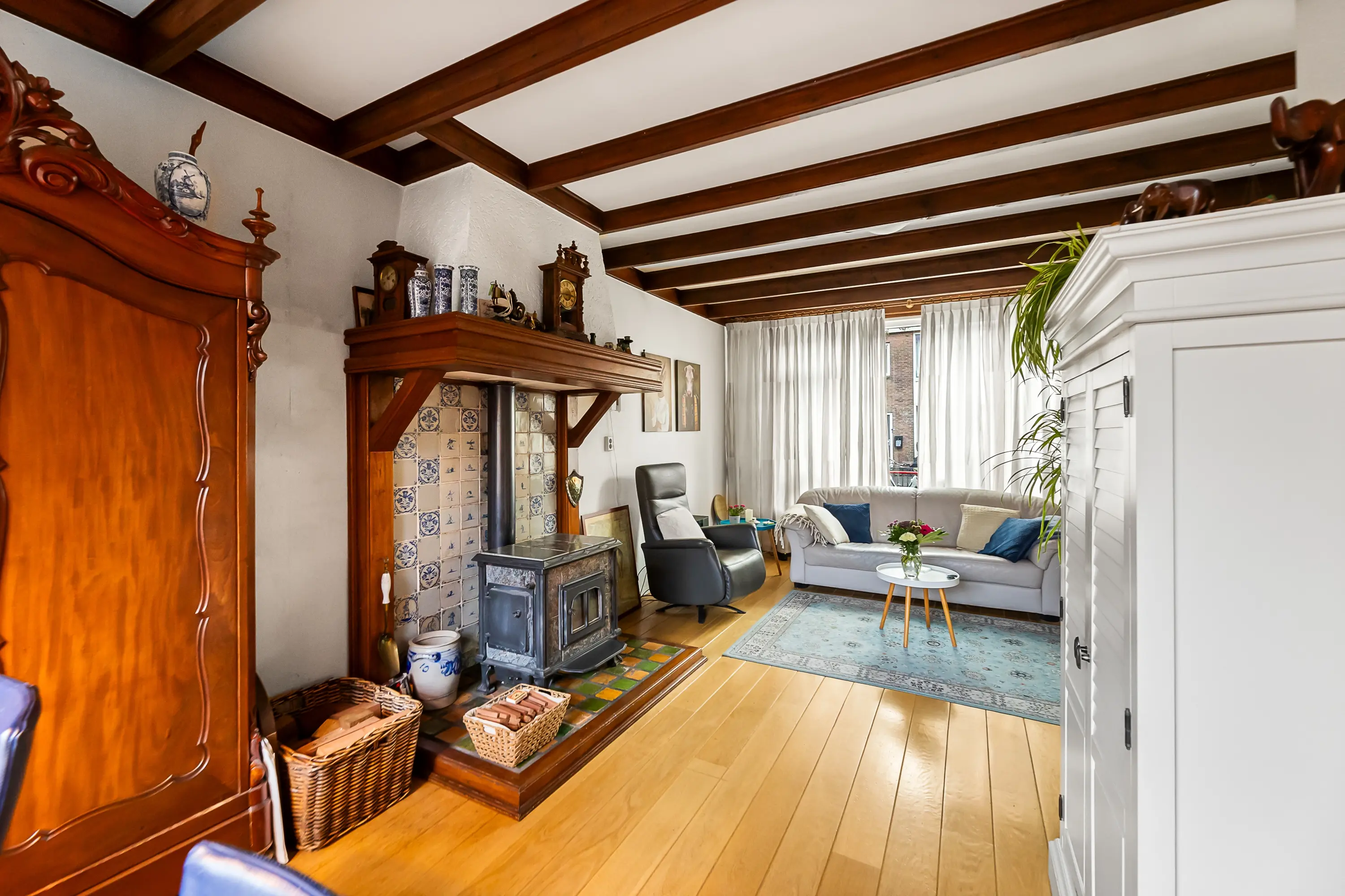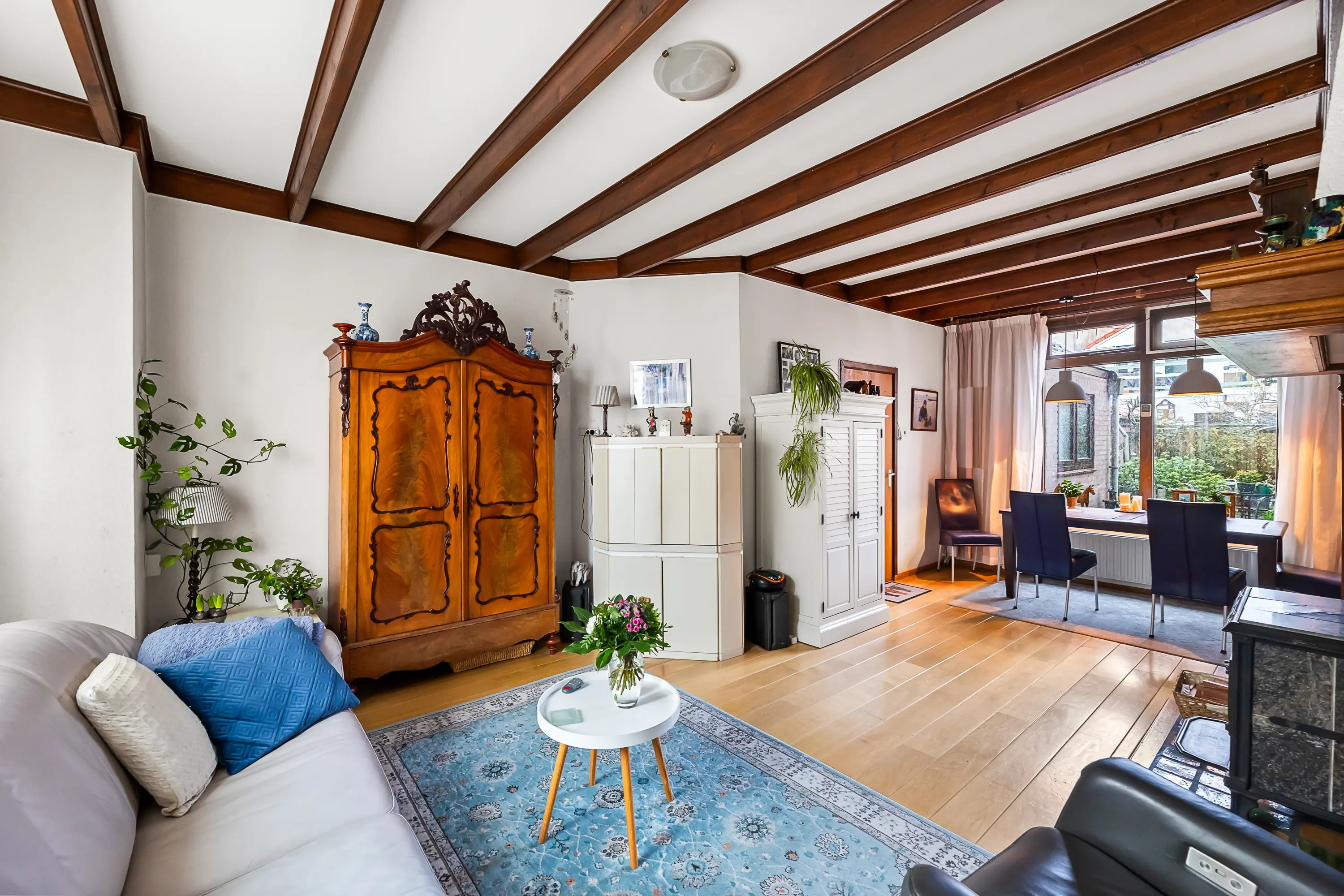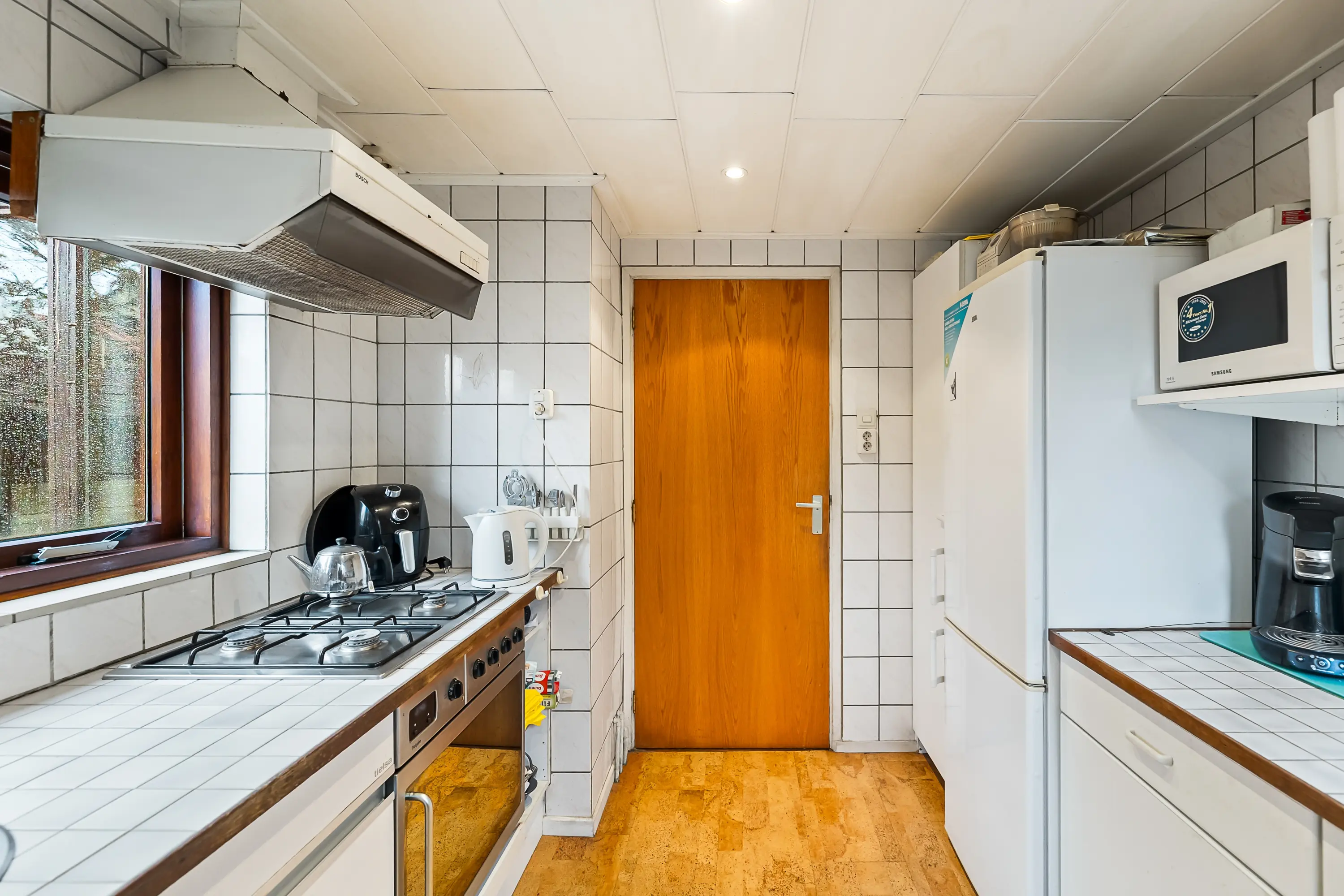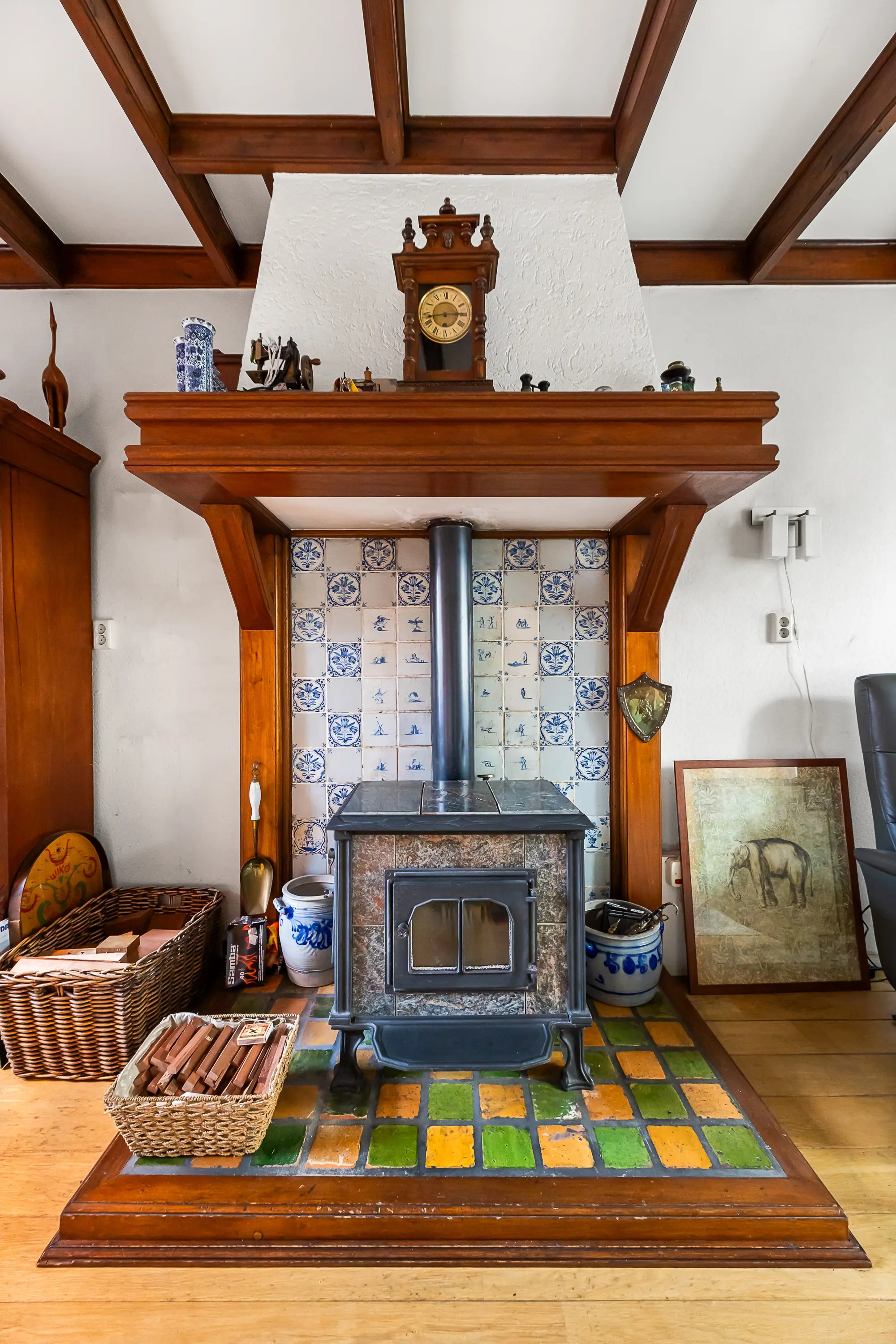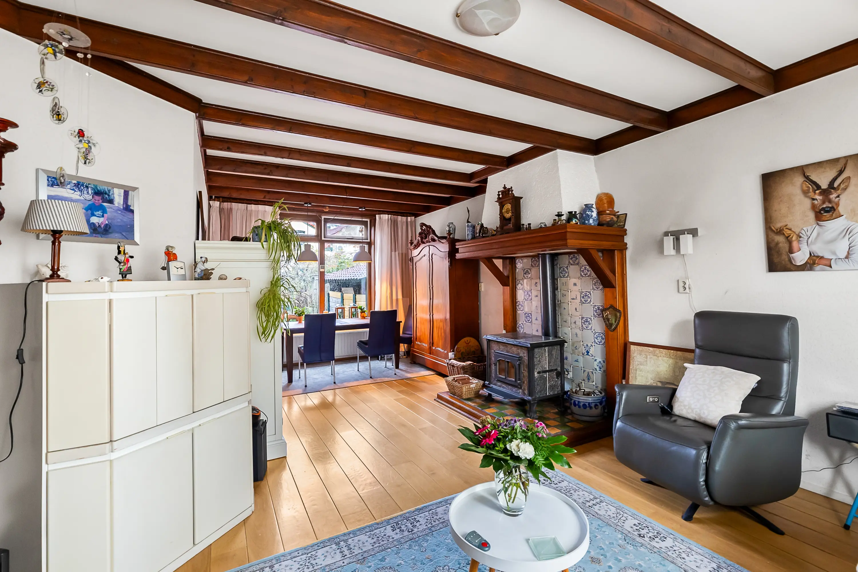 Hal met trapopgang en toilet. De woonkamer met houtkachel heeft lekker veel licht door de grote ramen. De dichte keuken, geplaatst in de uitbouw, is eenvoudig van uitvoering en geeft toegang tot de achtertuin.
