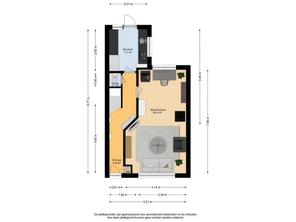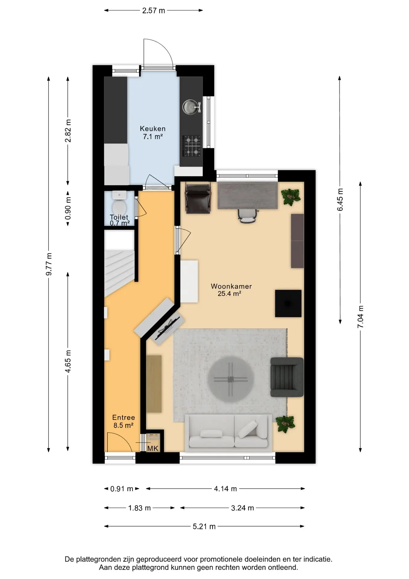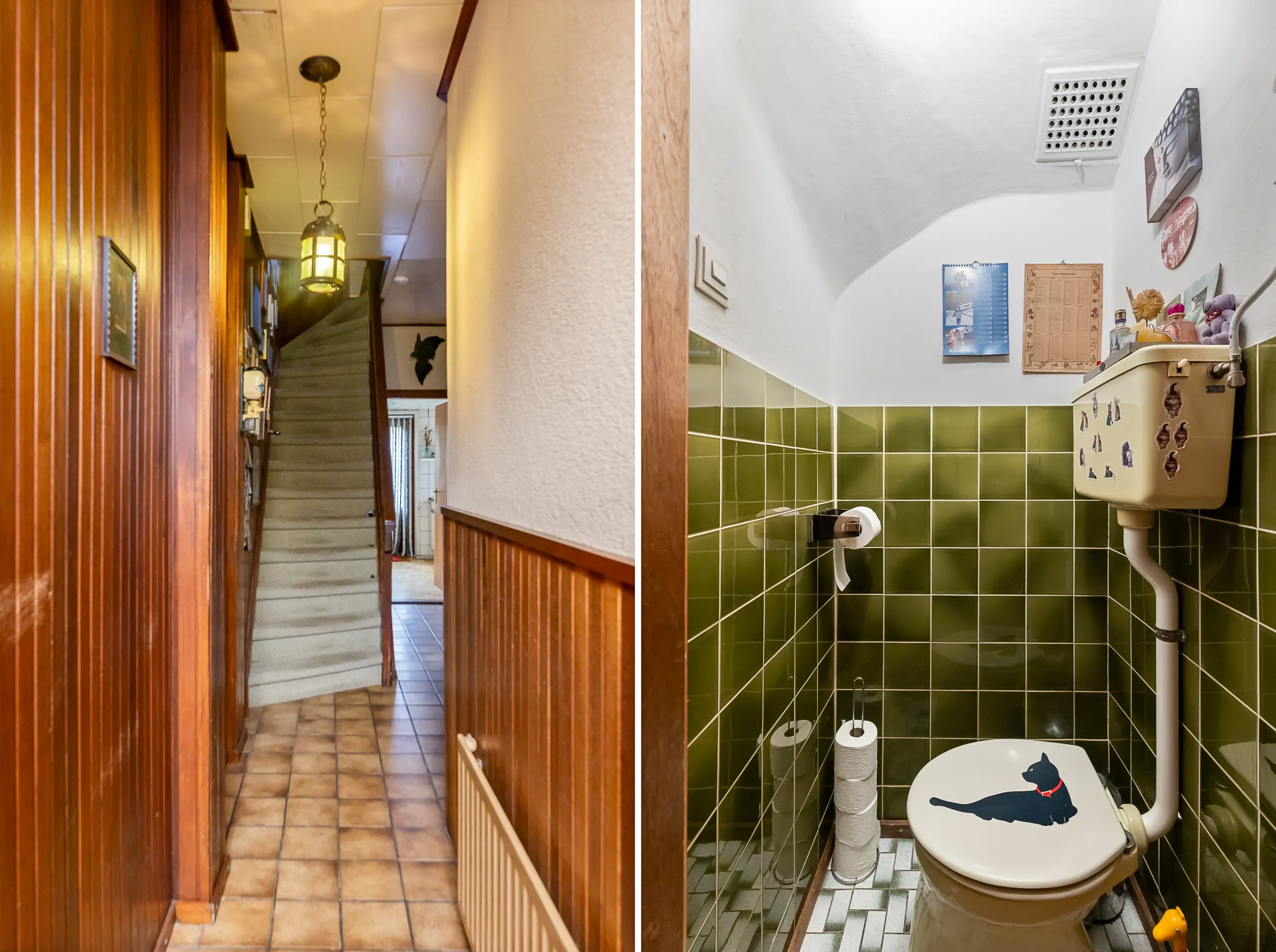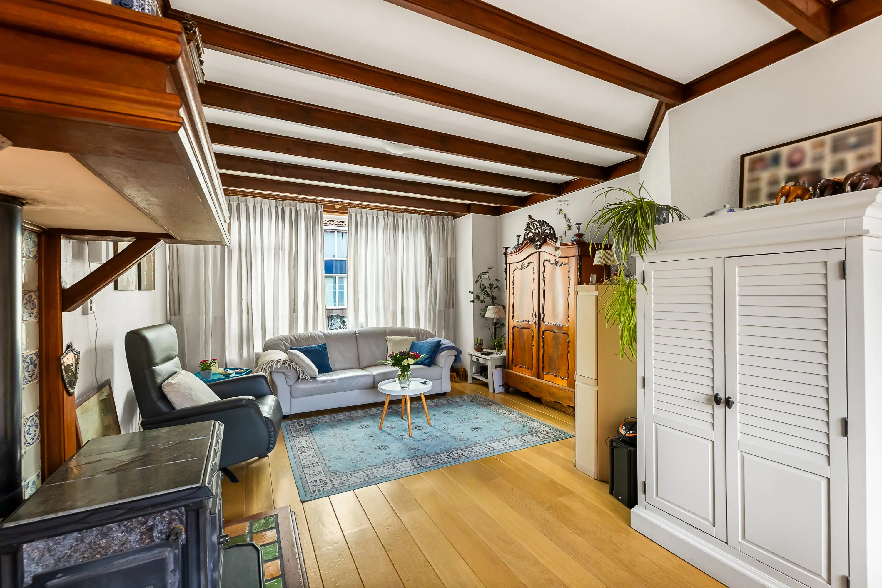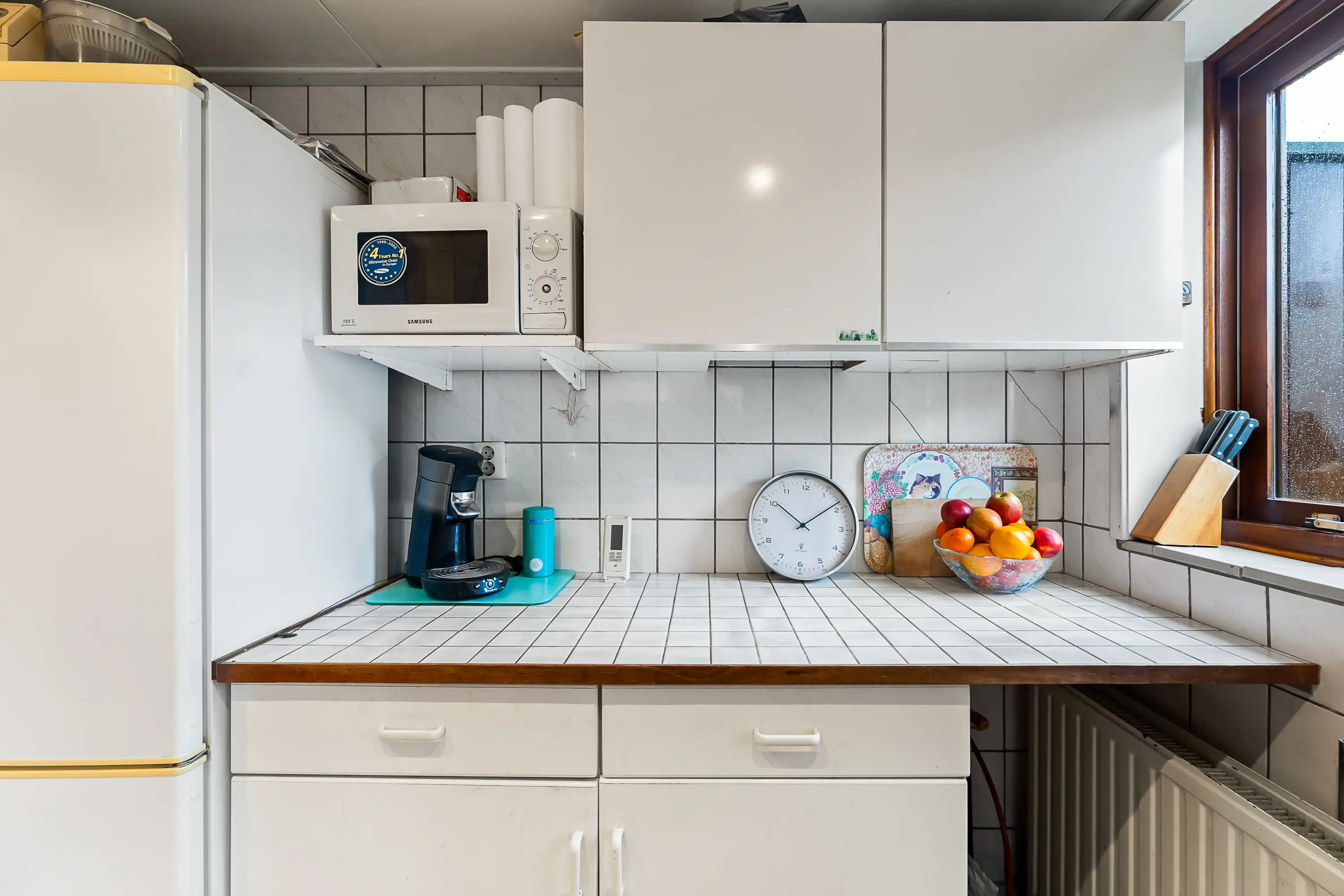 Hal met trapopgang en toilet. De woonkamer met houtkachel heeft lekker veel licht door de grote ramen. De dichte keuken, geplaatst in de uitbouw, is eenvoudig van uitvoering en geeft toegang tot de achtertuin.