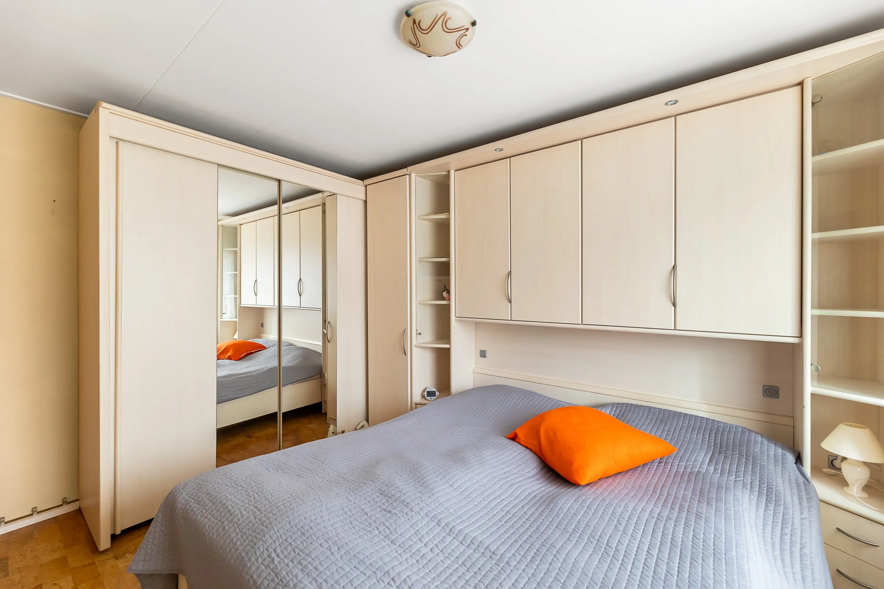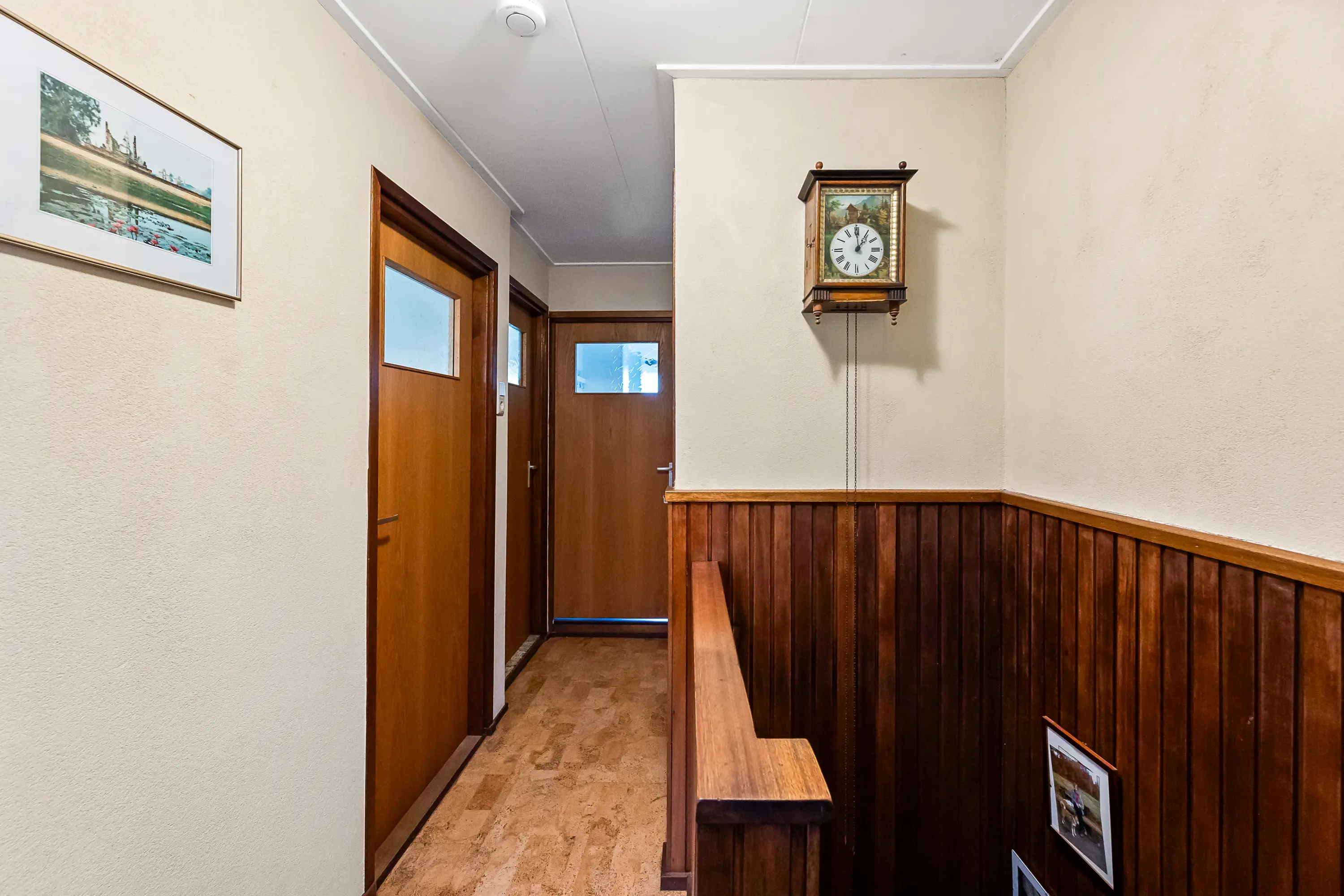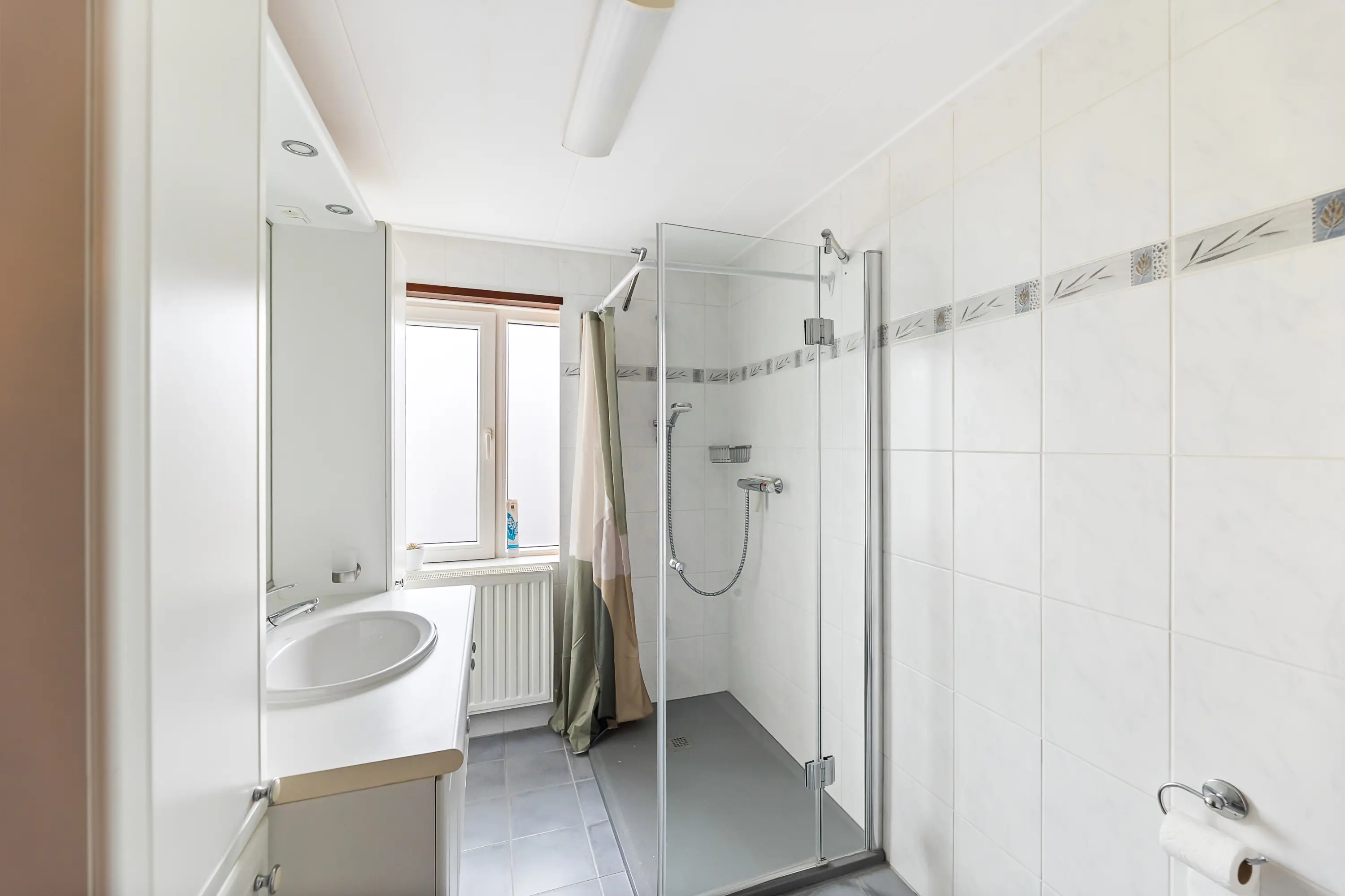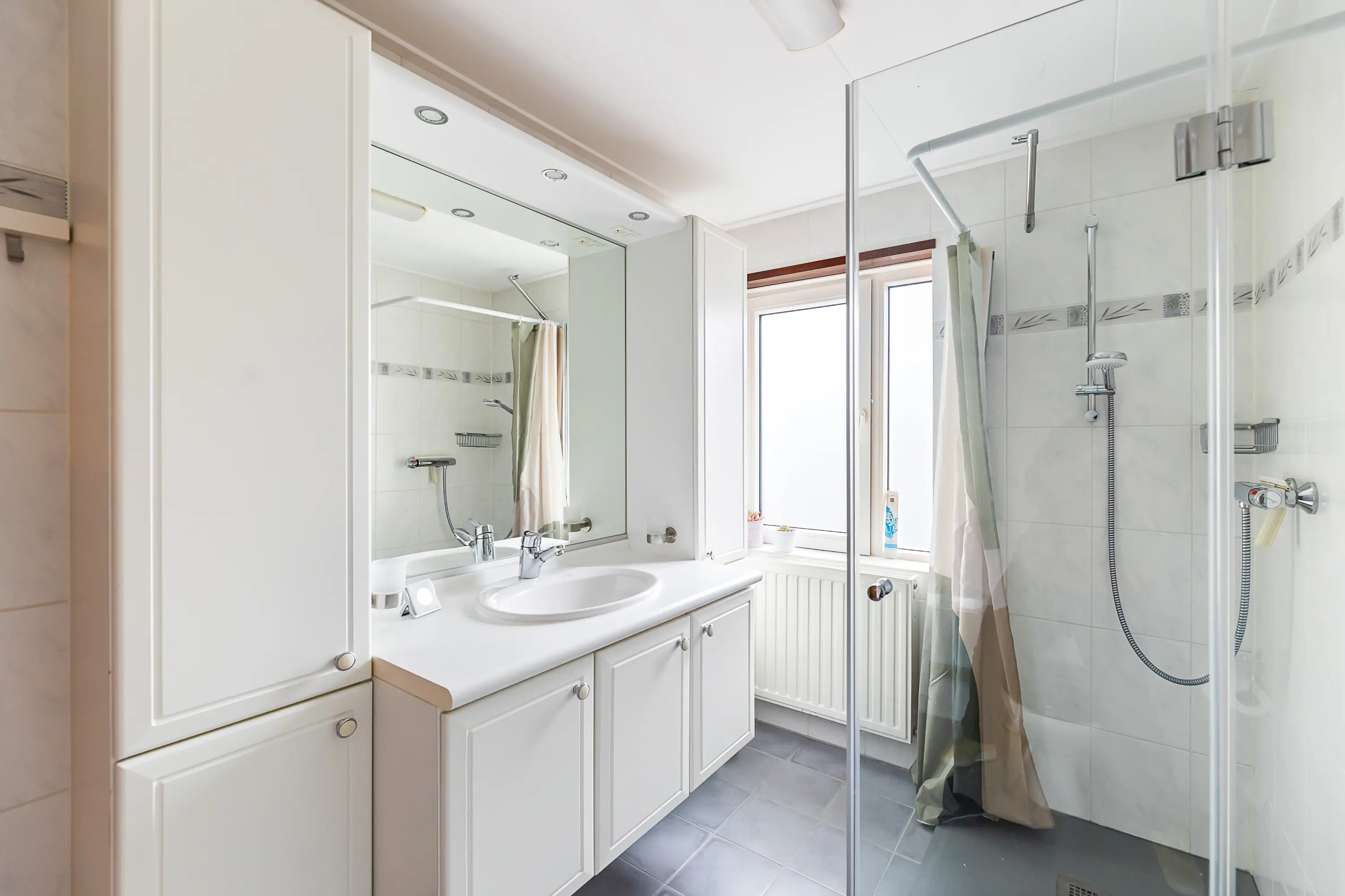 Overloop met kastruimte en twee royale slaapkamers. De badkamer is netjes en voorzien van toilet, douche en wastafelmeubel.