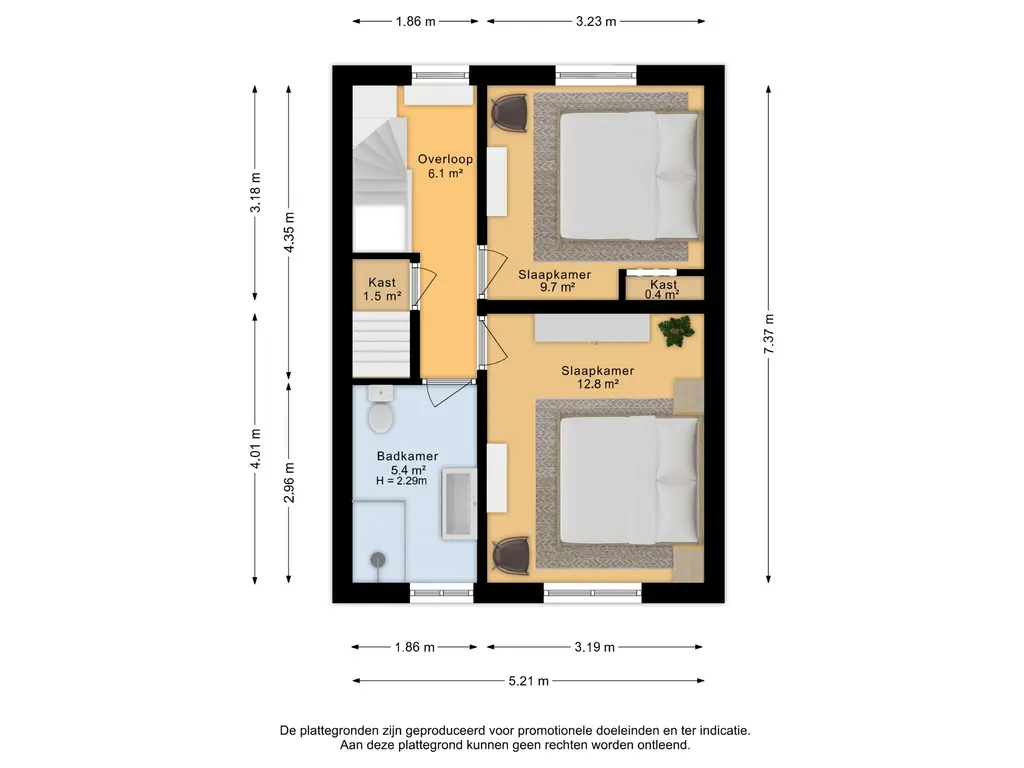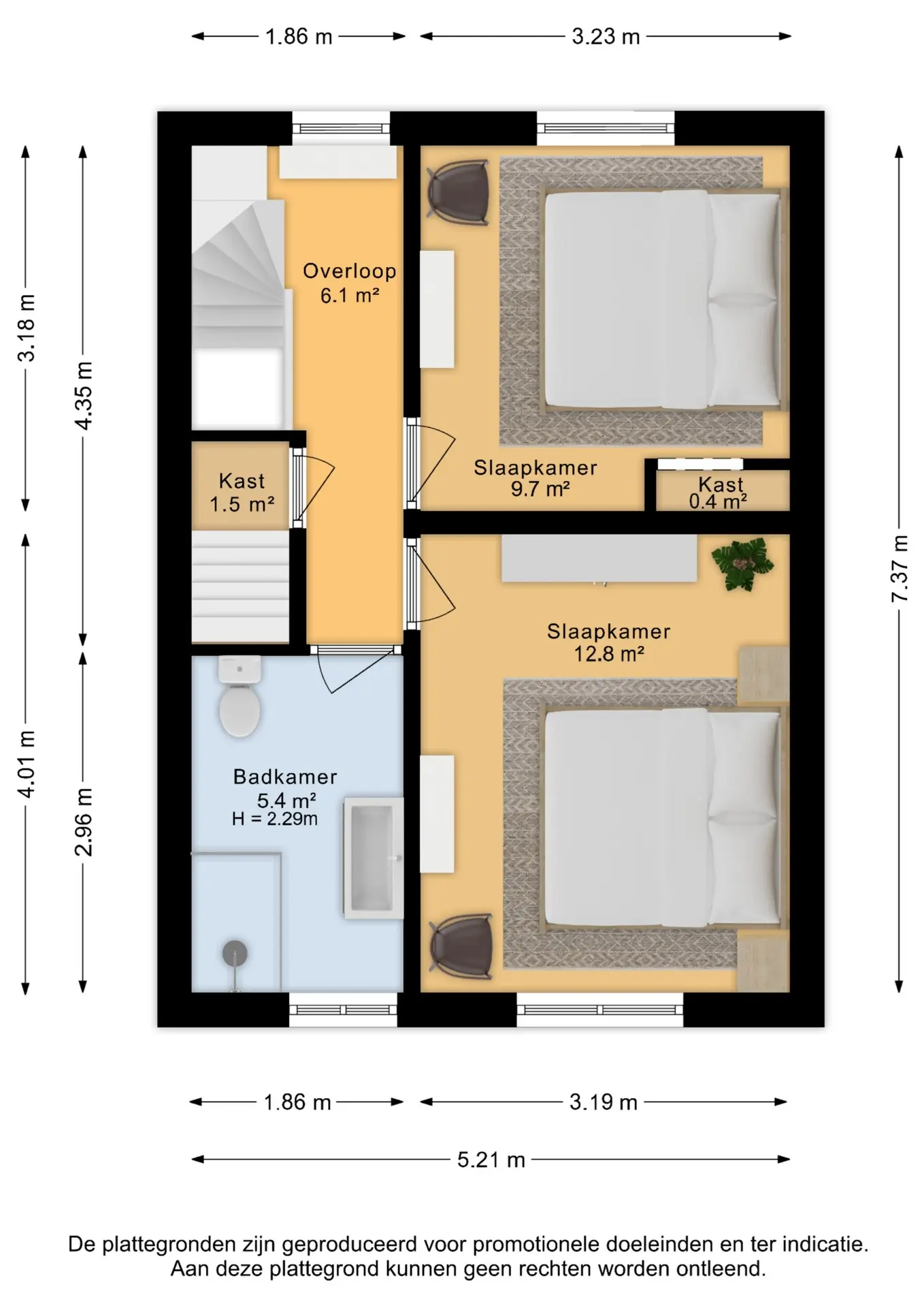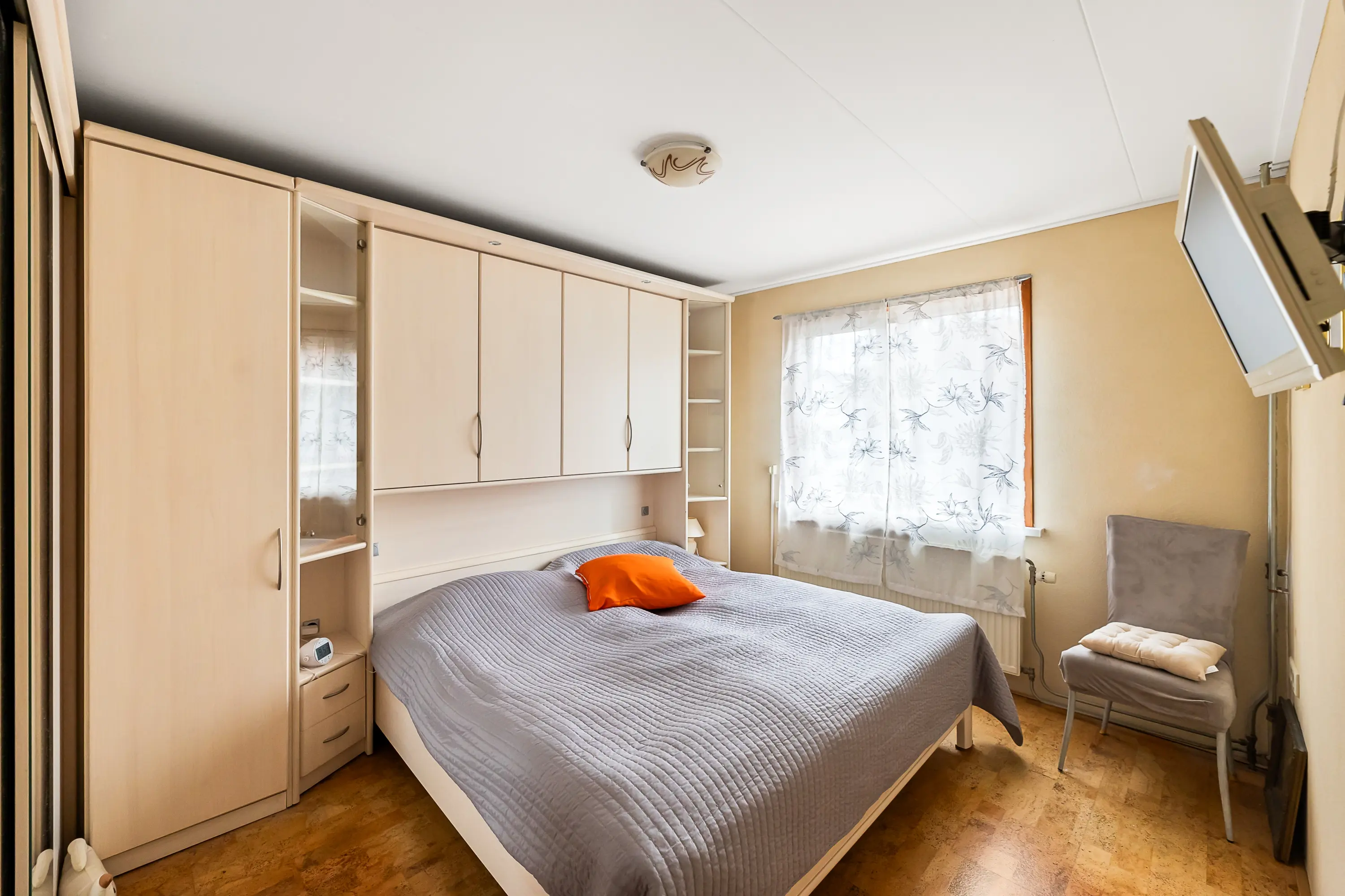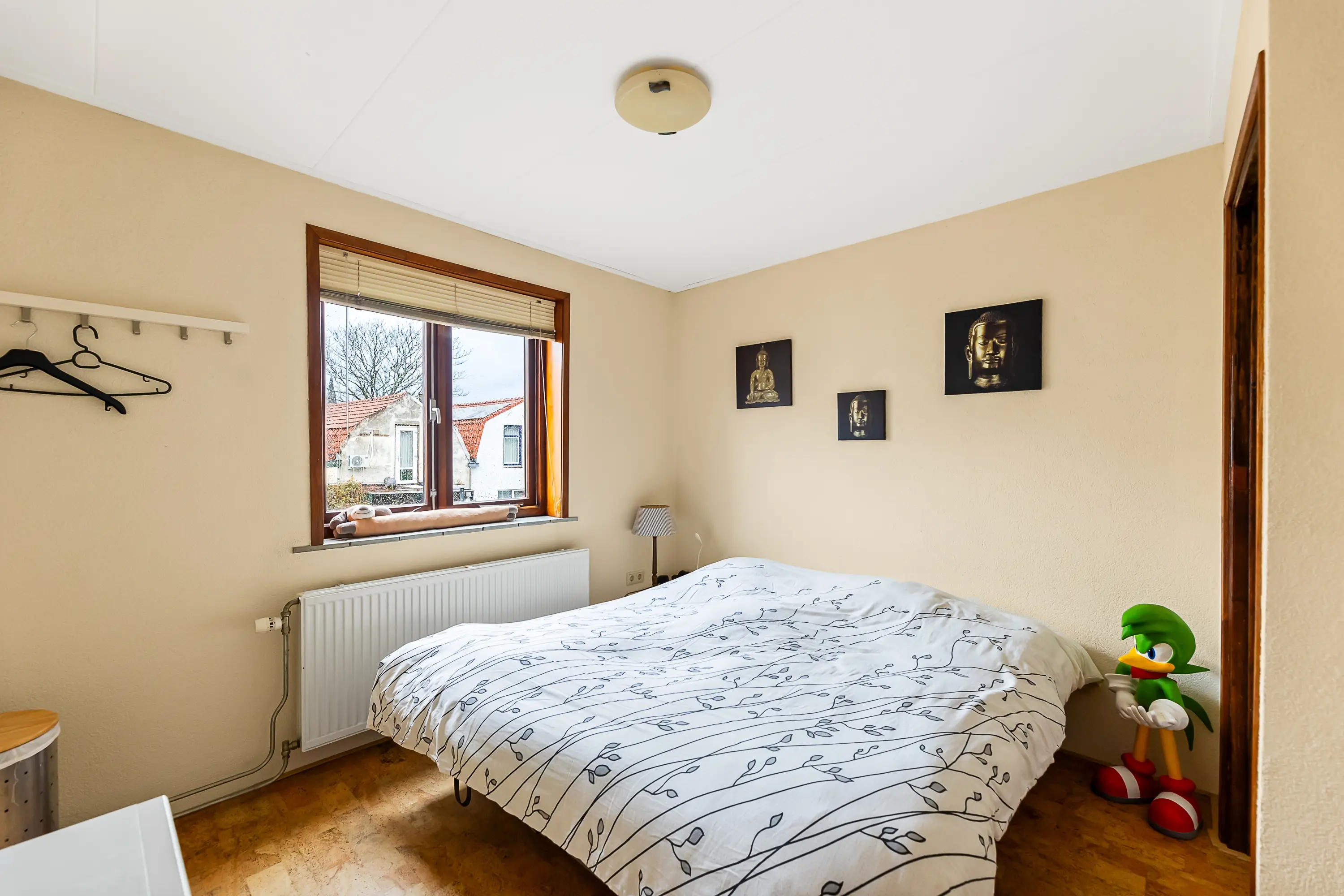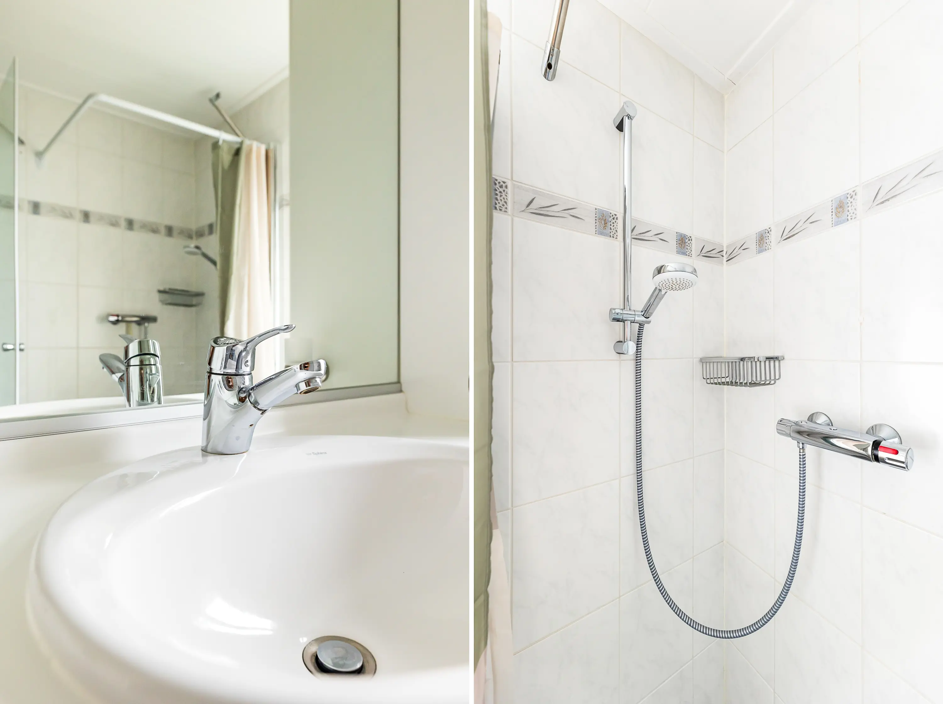 Overloop met kastruimte en twee royale slaapkamers. De badkamer is netjes en voorzien van toilet, douche en wastafelmeubel.