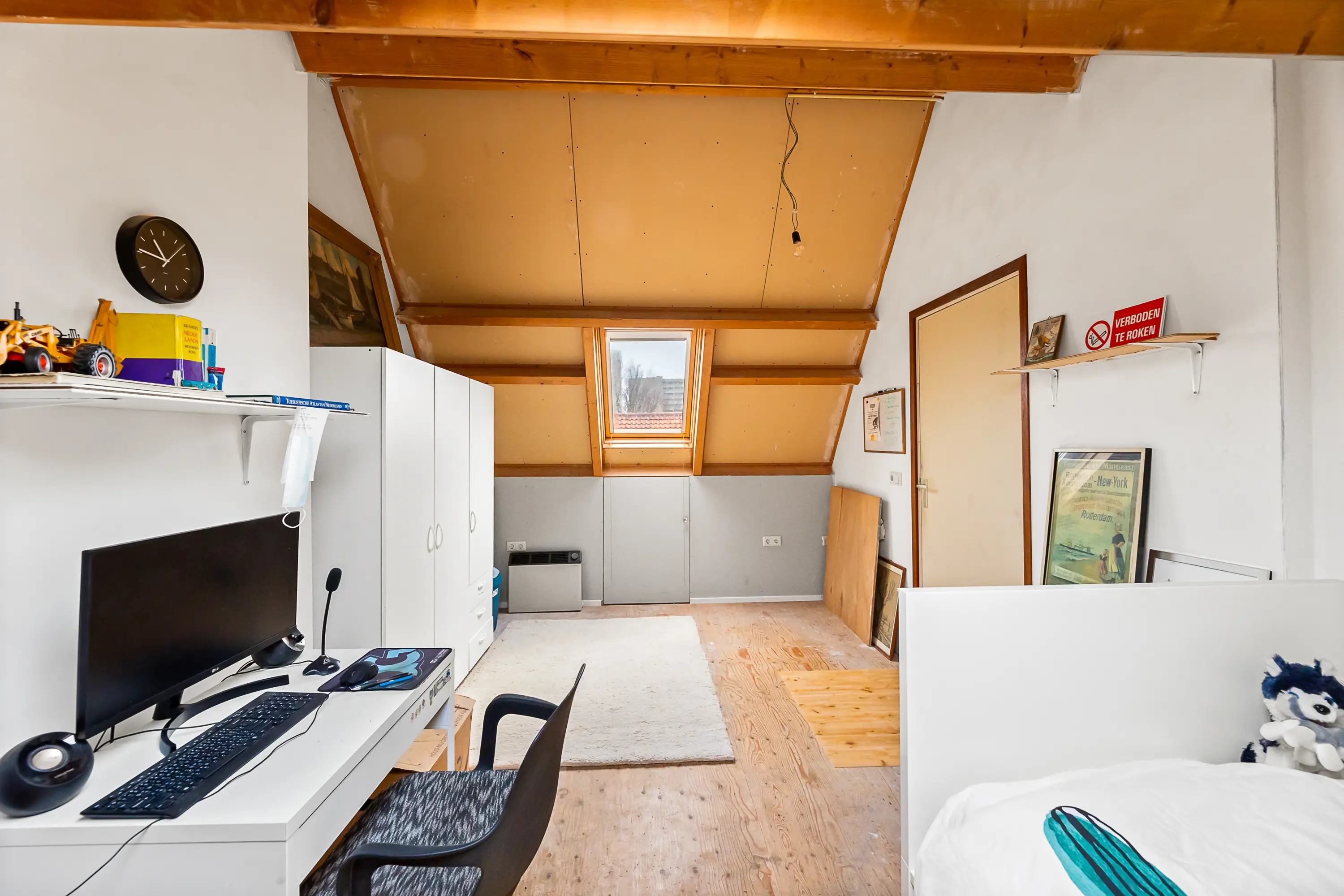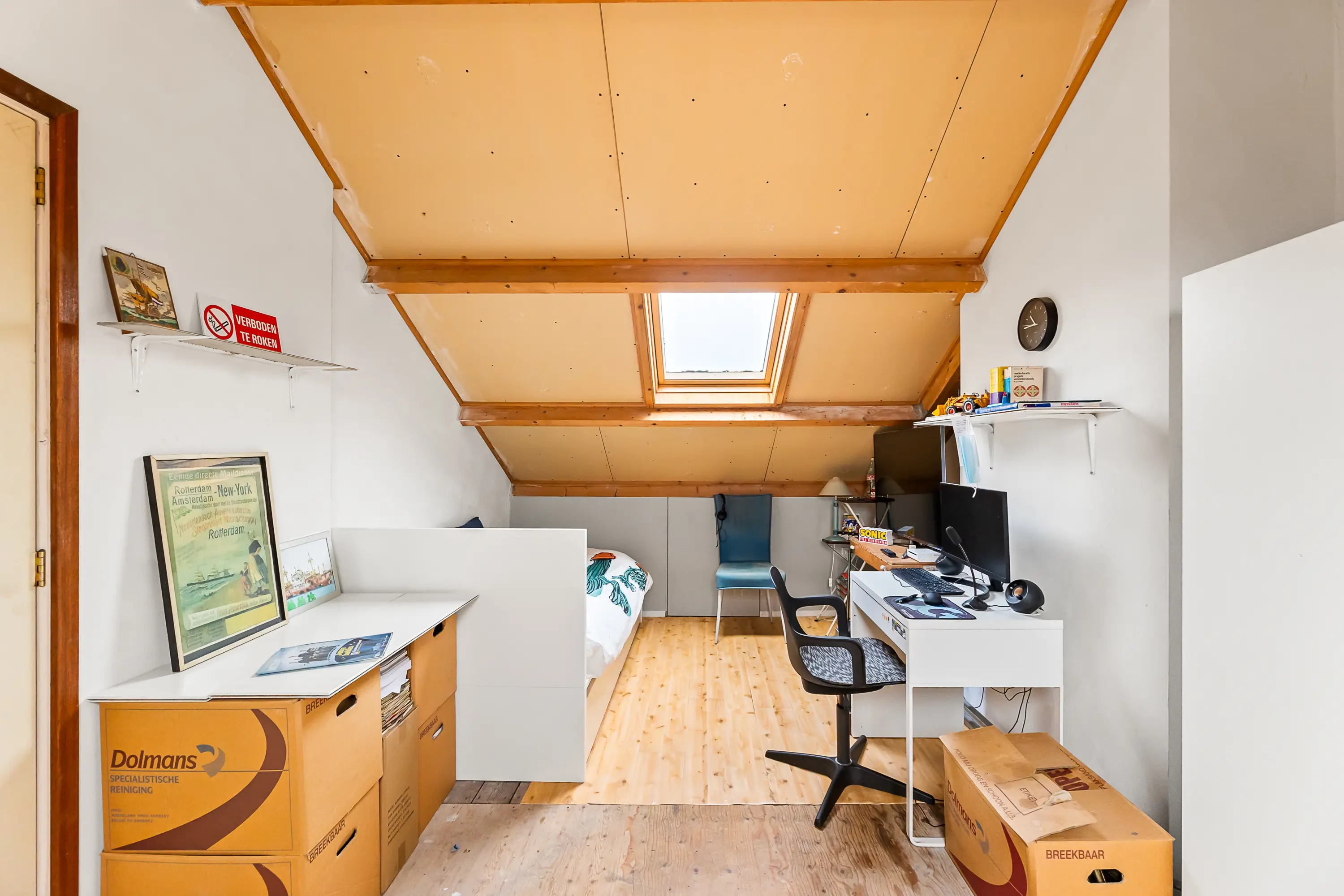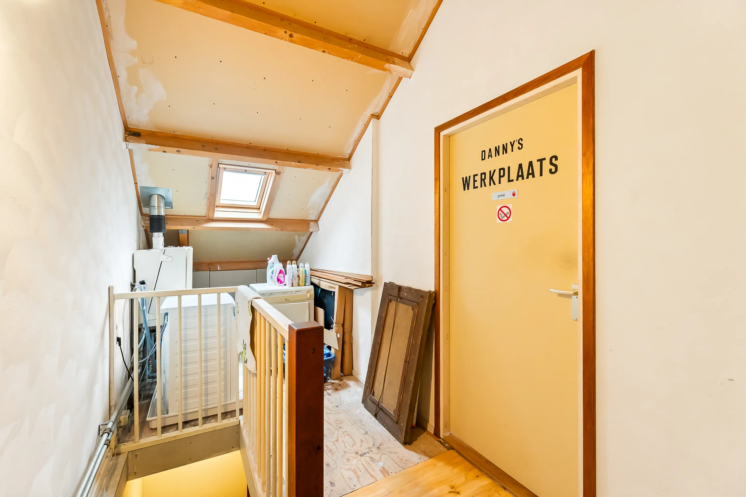 Te bereiken met een vaste trap. Overloop met opstelling van de c.v.-installatie en de aansluiting voor het witgoed. Er is een verrassende zolderkamer met twee Veluxramen.