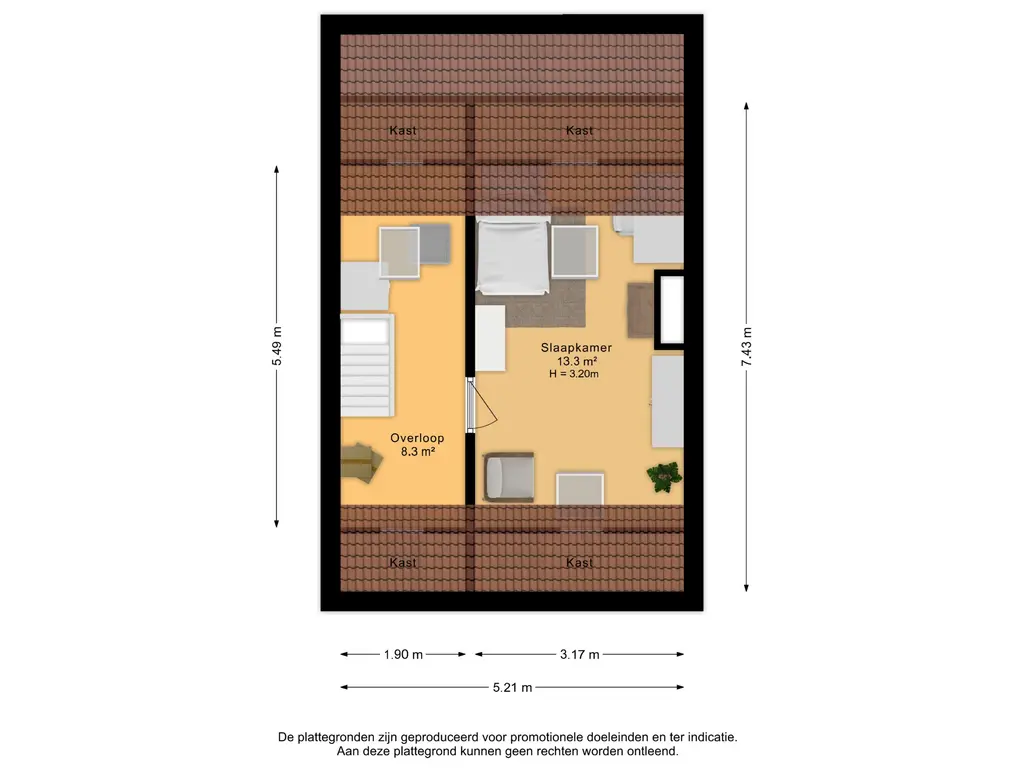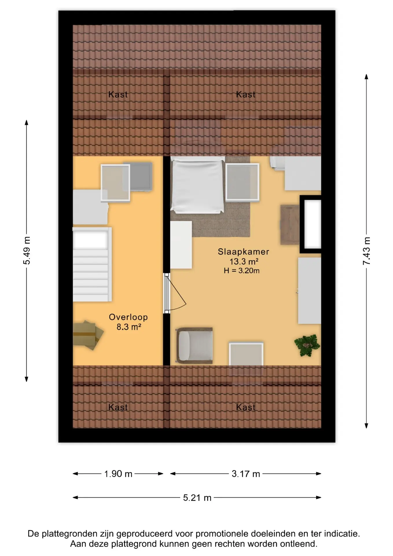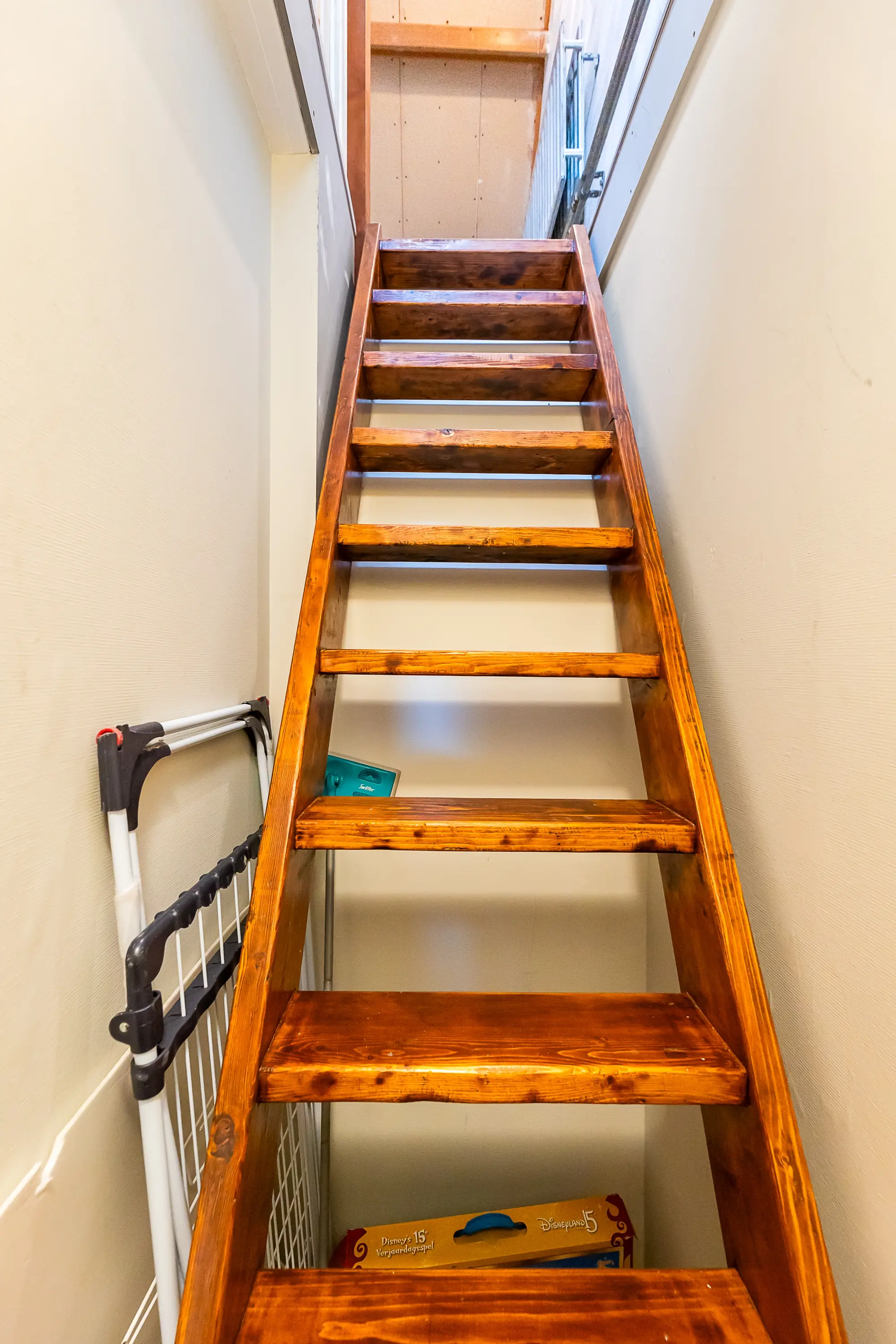 Te bereiken met een vaste trap. Overloop met opstelling van de c.v.-installatie en de aansluiting voor het witgoed. Er is een verrassende zolderkamer met twee Veluxramen.