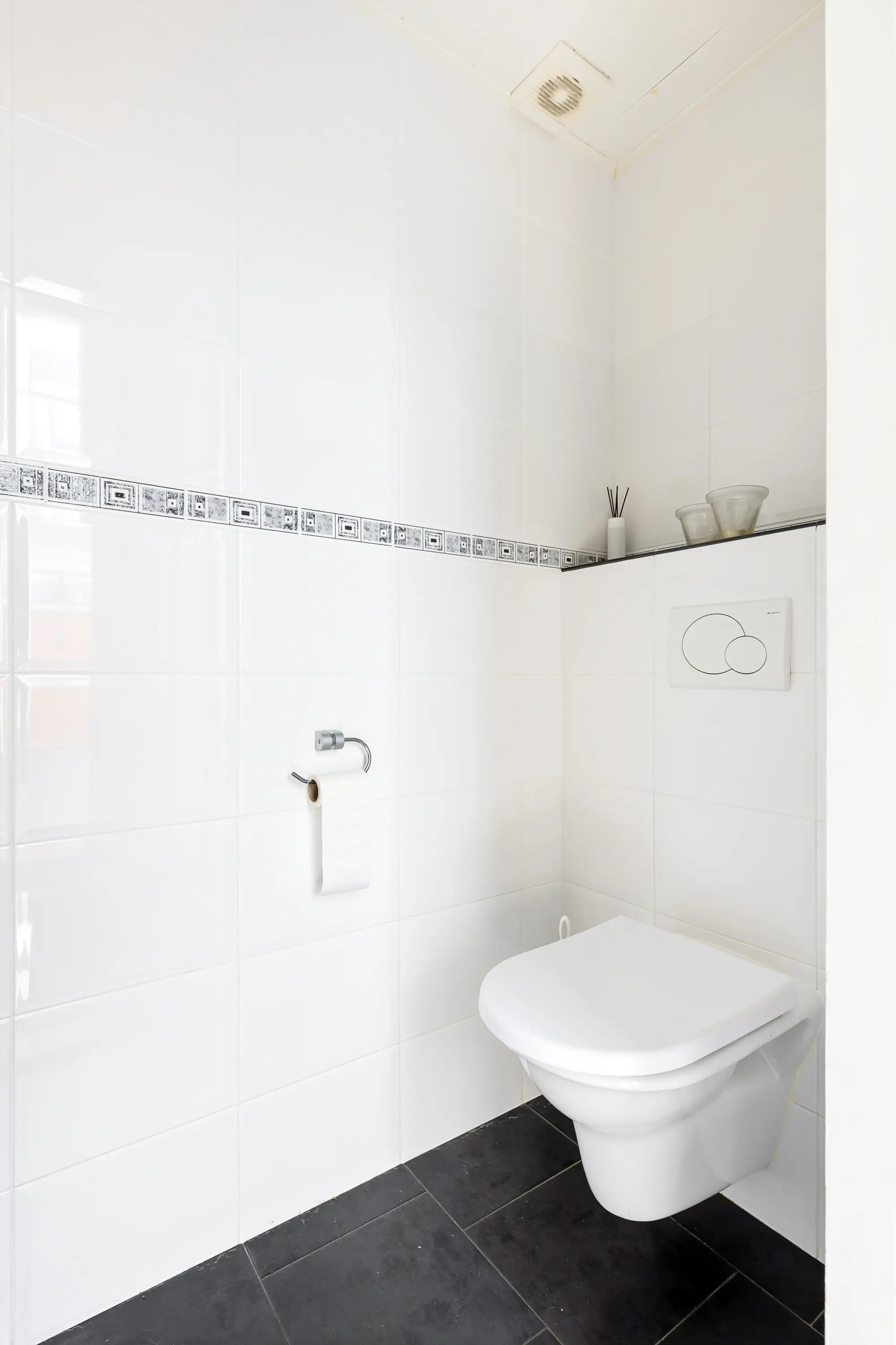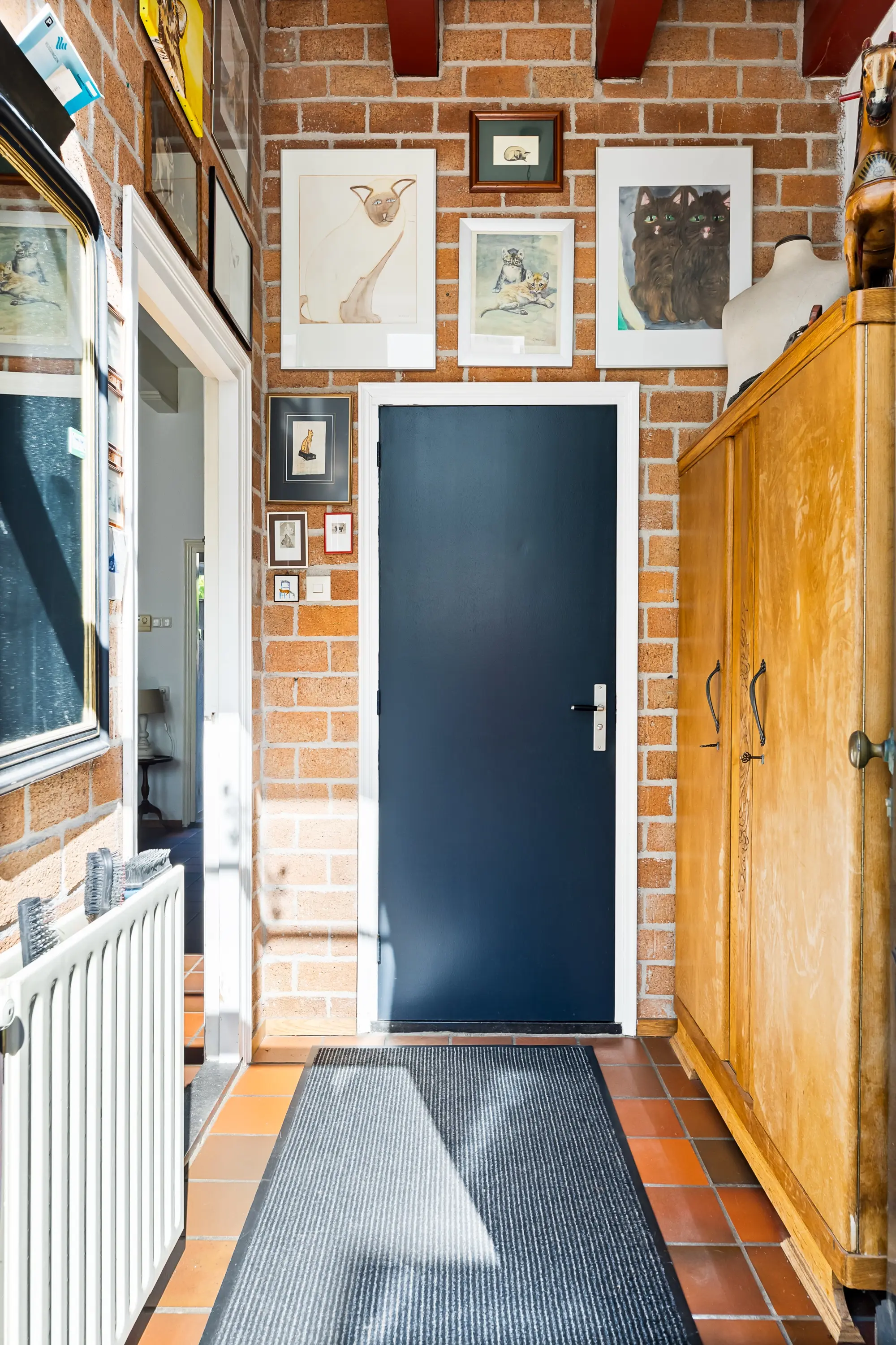 De trap naar de verdieping bevind zich in een aparte ruimte aan de achterzijde van het huis. Hier is ook plaats voor de wasmachine.