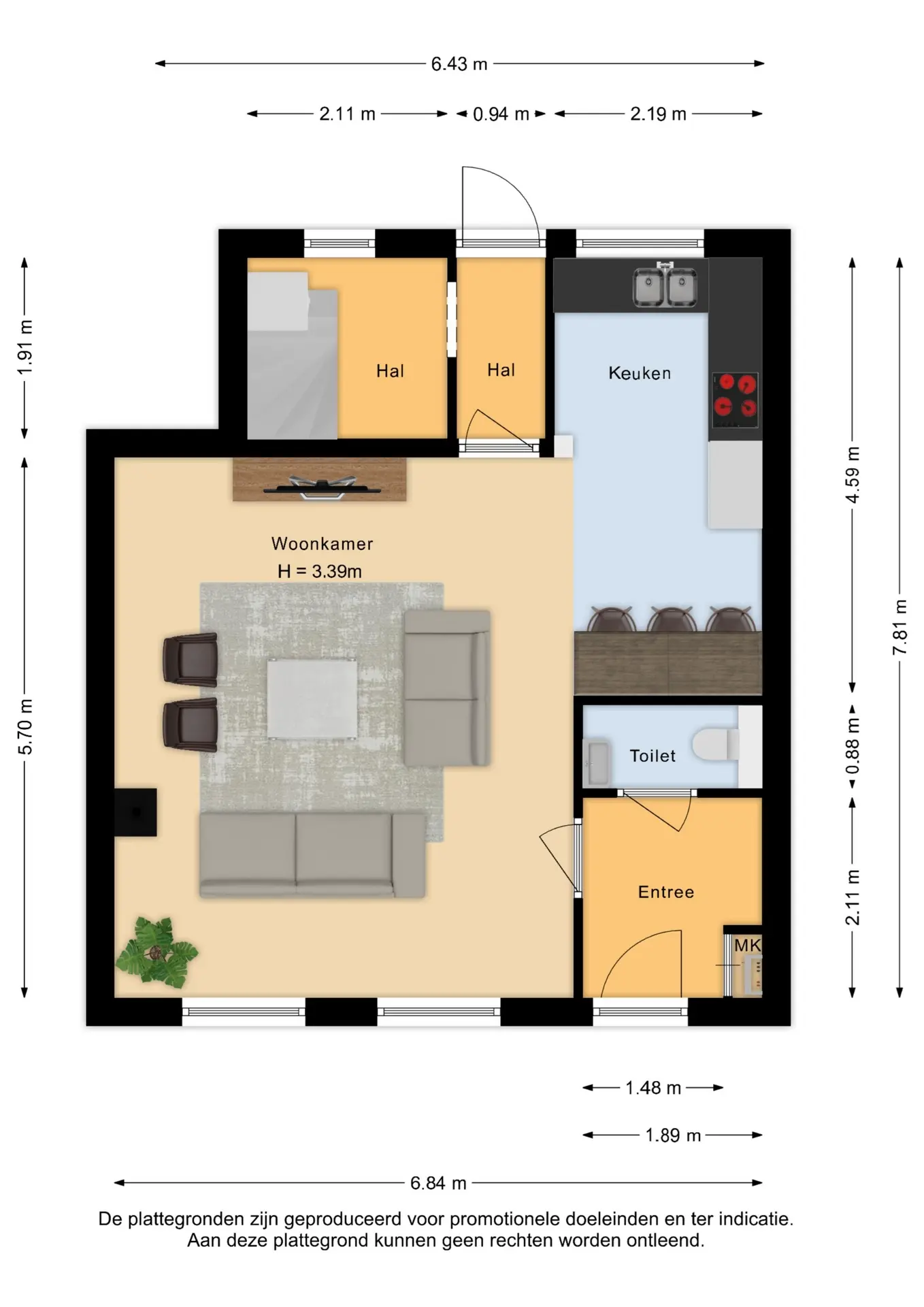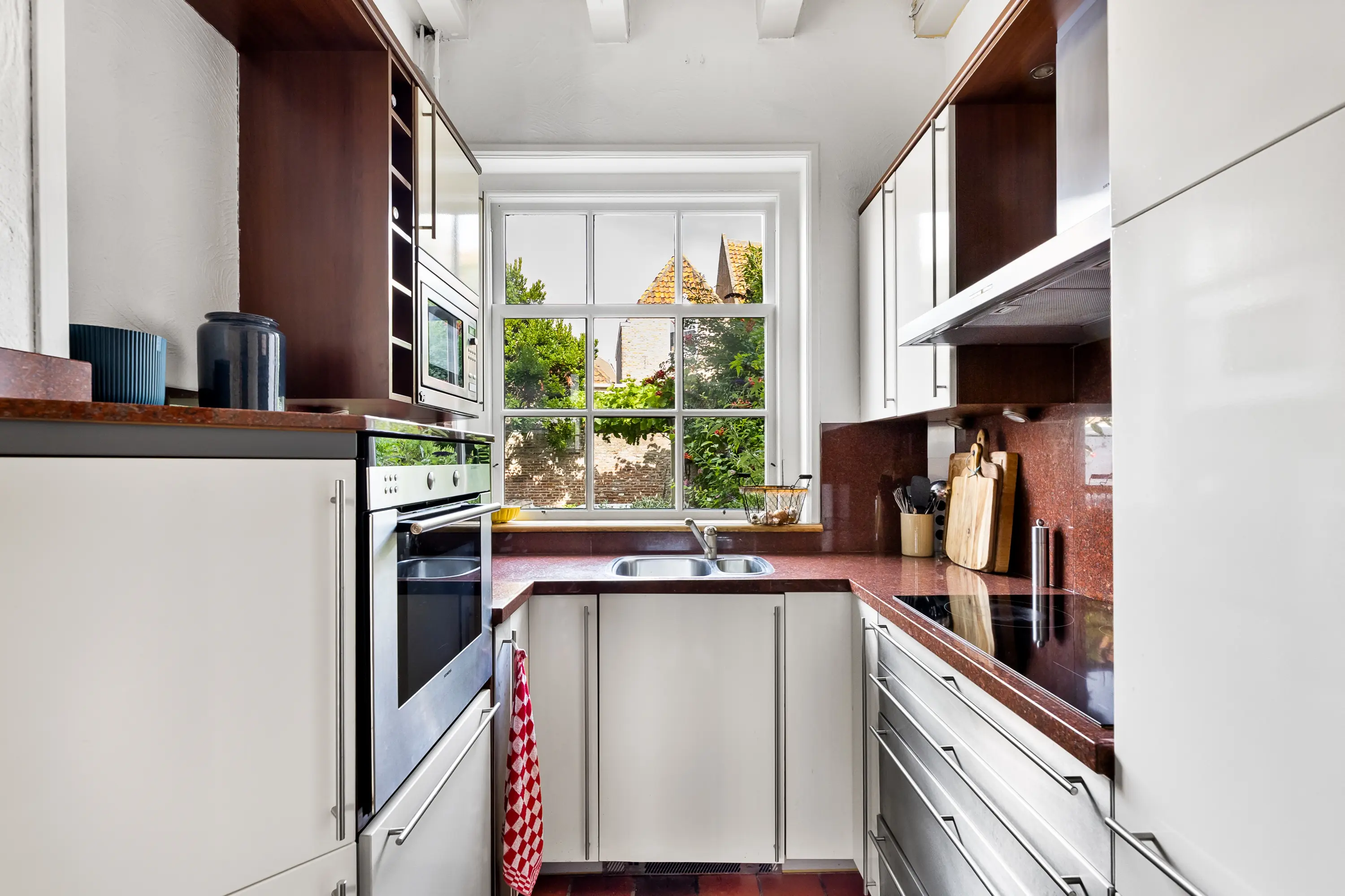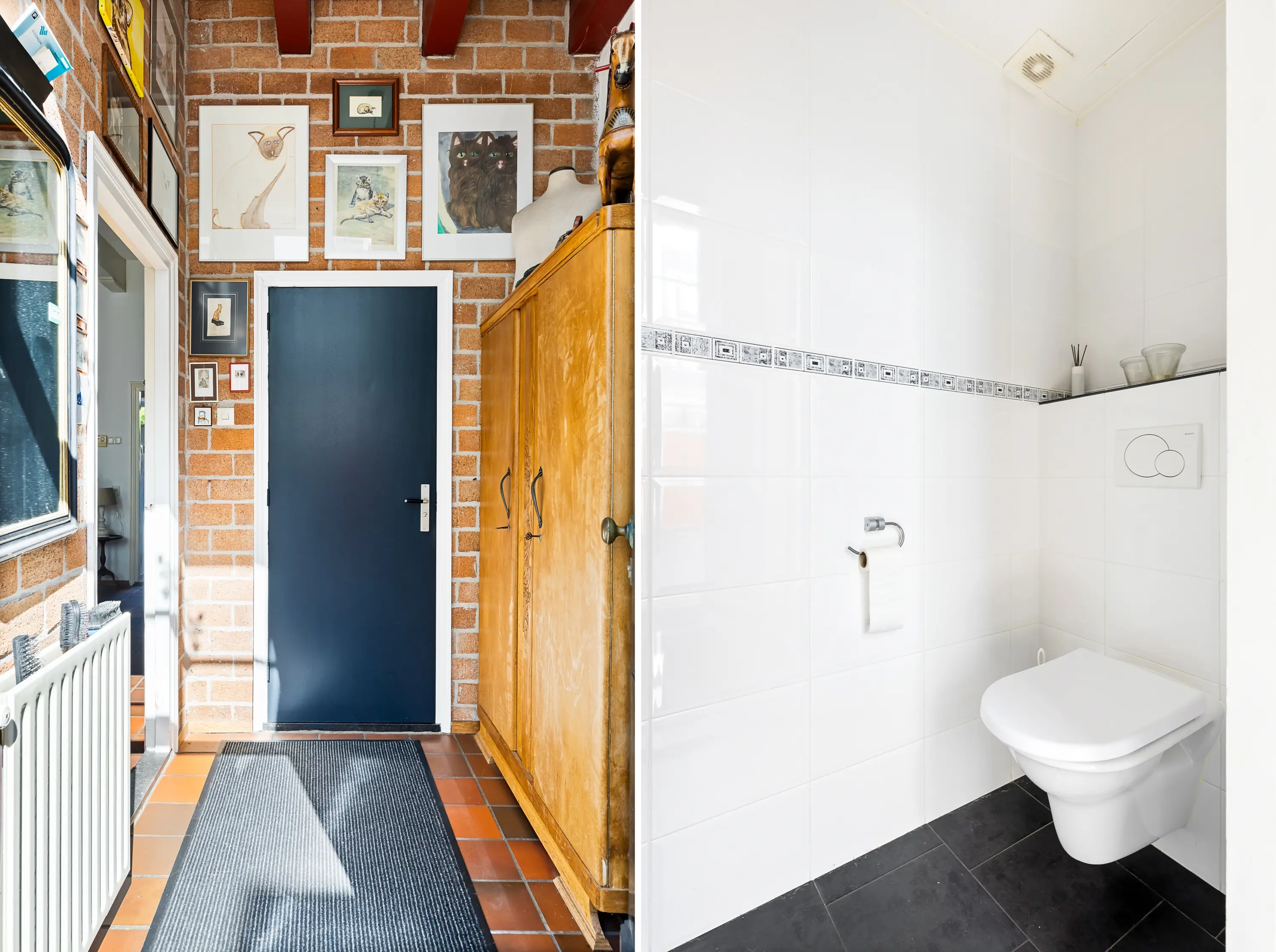 Entree met meterkast, toilet en toegang tot de woonkamer. De woonkamer is ruim en ademt de sfeer van vroeger uit. De keuken is compleet in een lichte kleurstelling en voorzien van inductiekookplaat, oven, magnetron, koelkast, vriezer en vaatwasser.