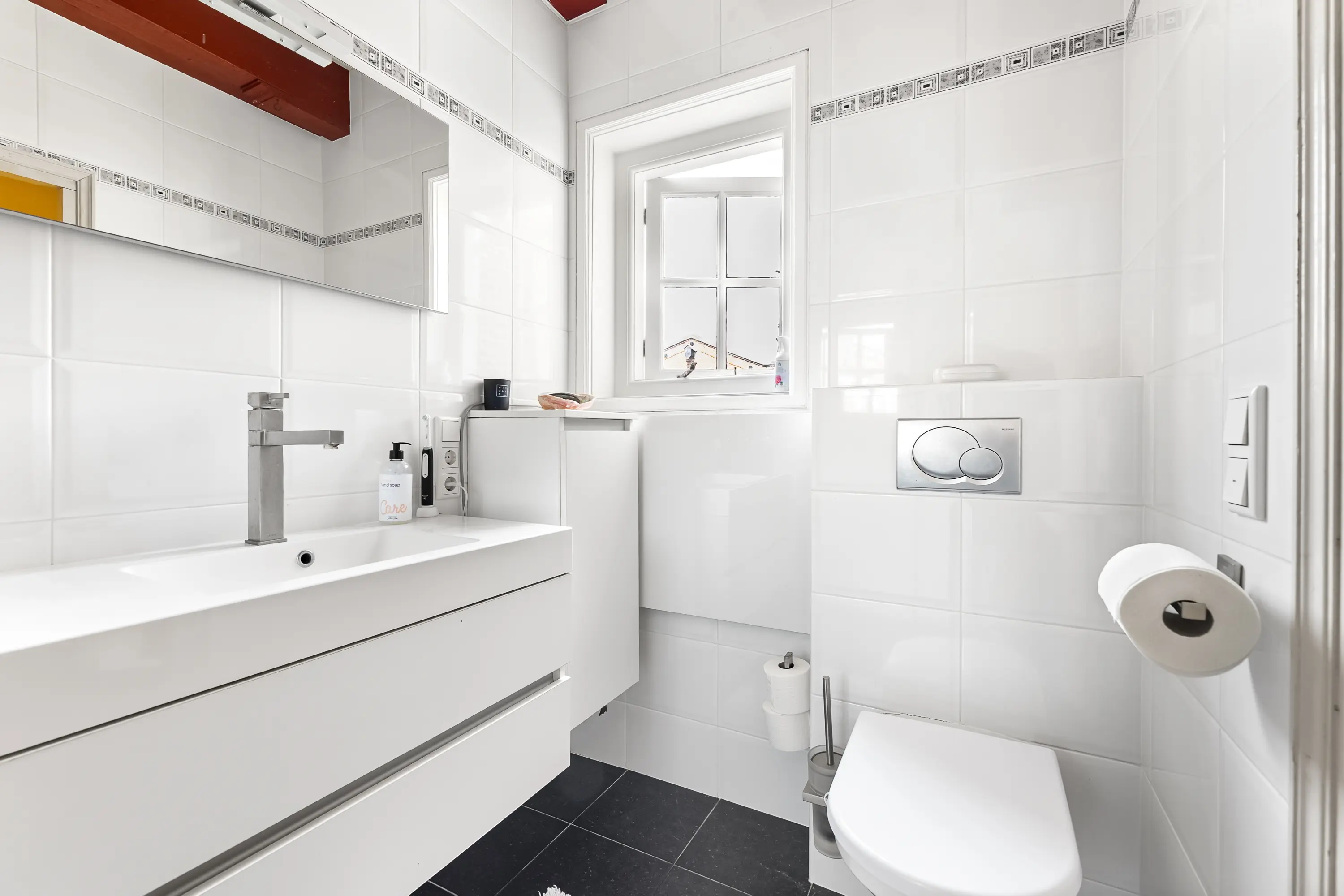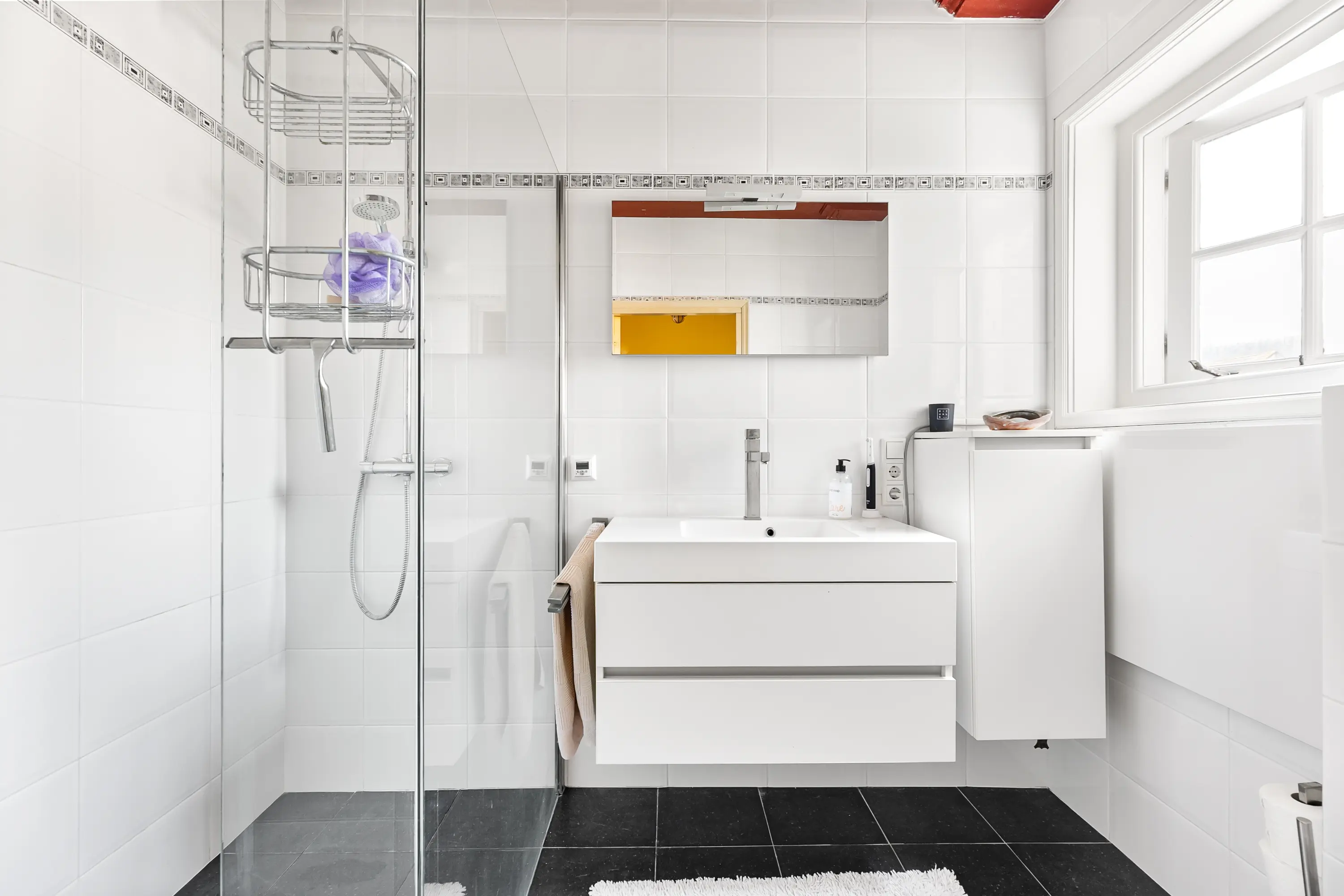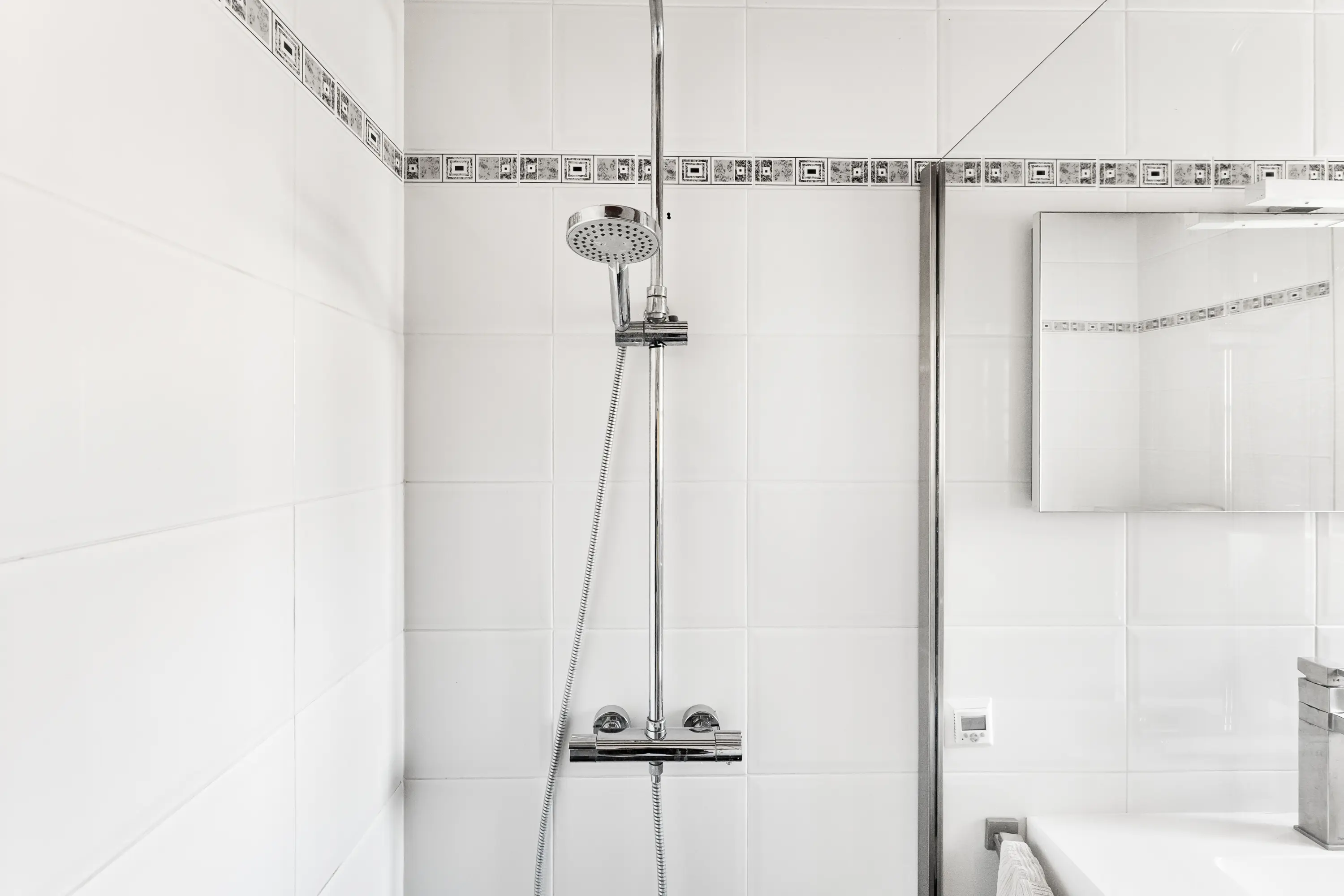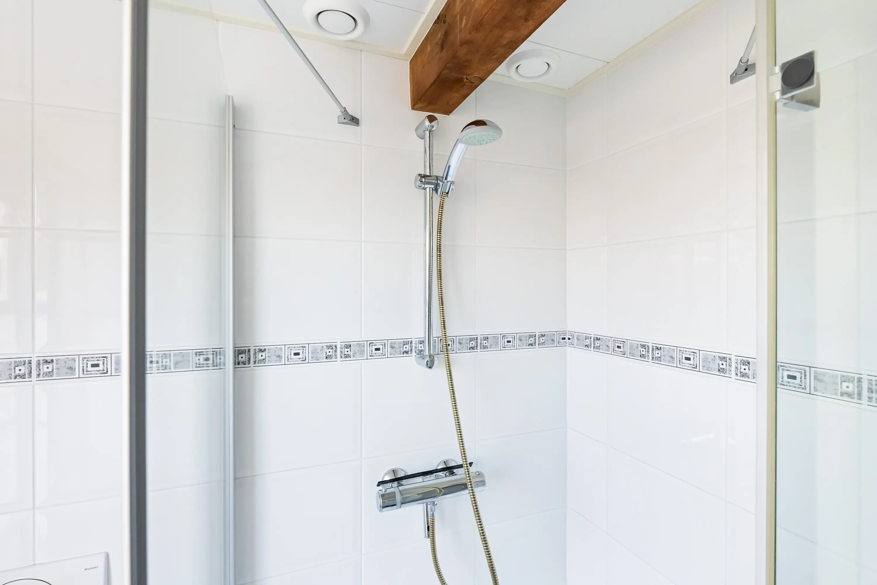 Overloop en twee slaapkamers aan de voorzijde. Complete, netjes afgewerkte badkamer met wastafel een inloopdouche en toilet.