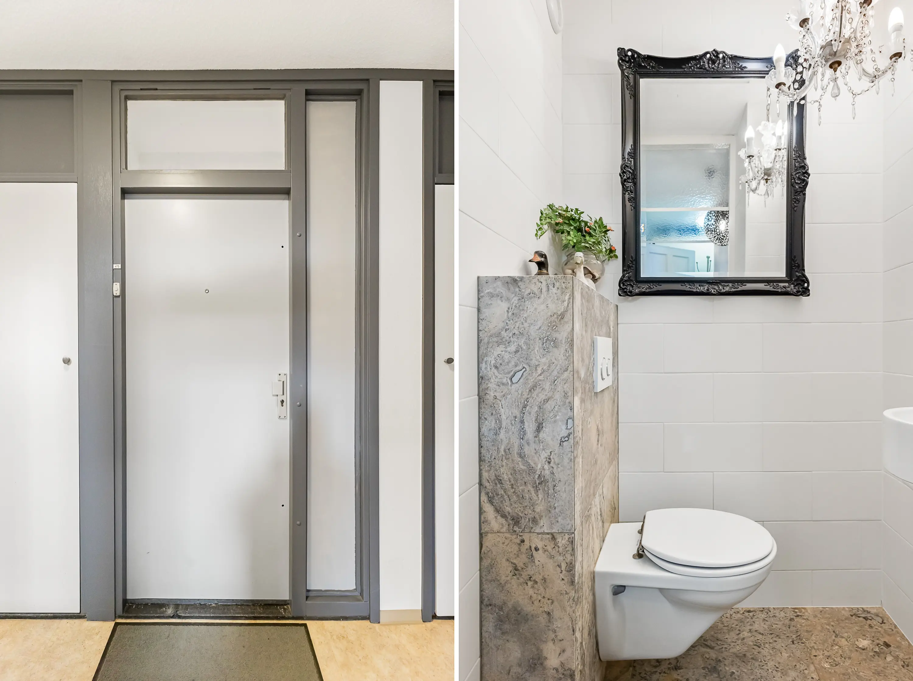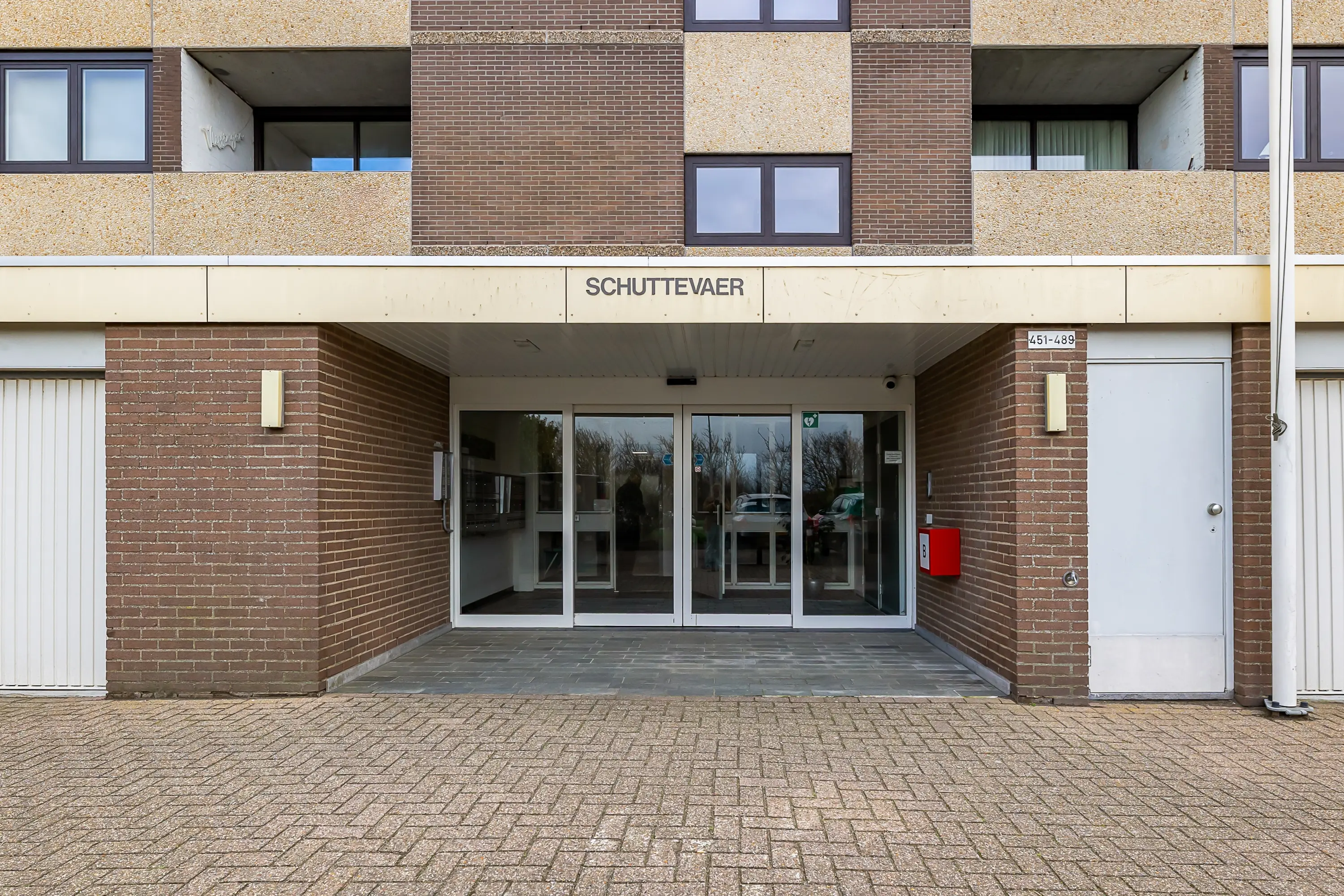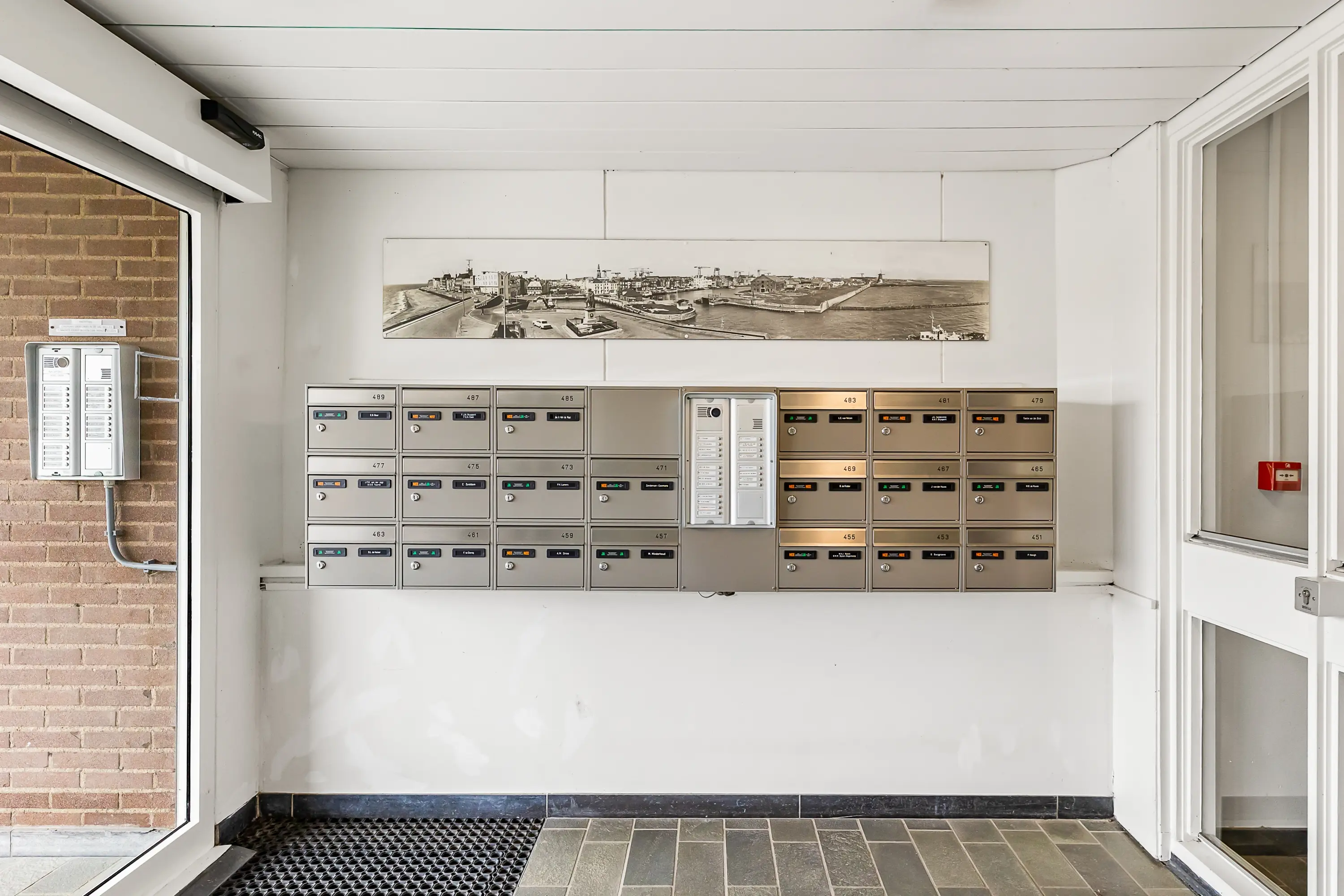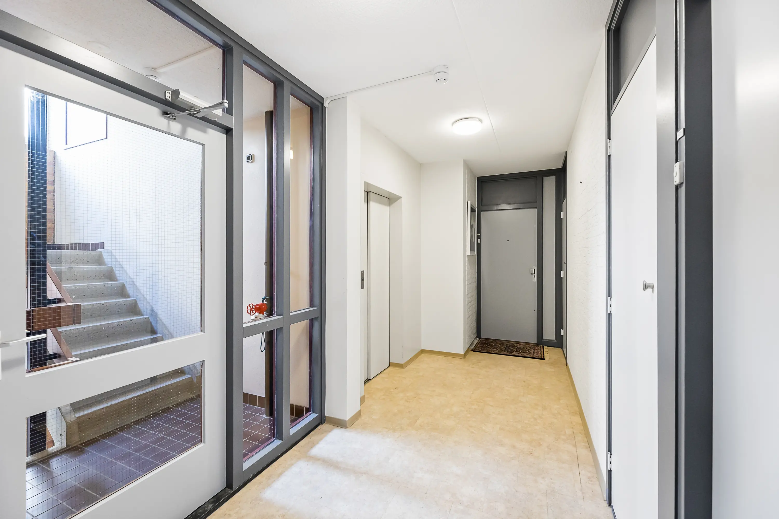Centrale entree met brievenbussen, hal, toegang tot de lift en het trappenhuis.