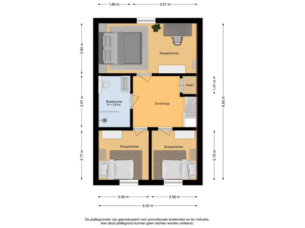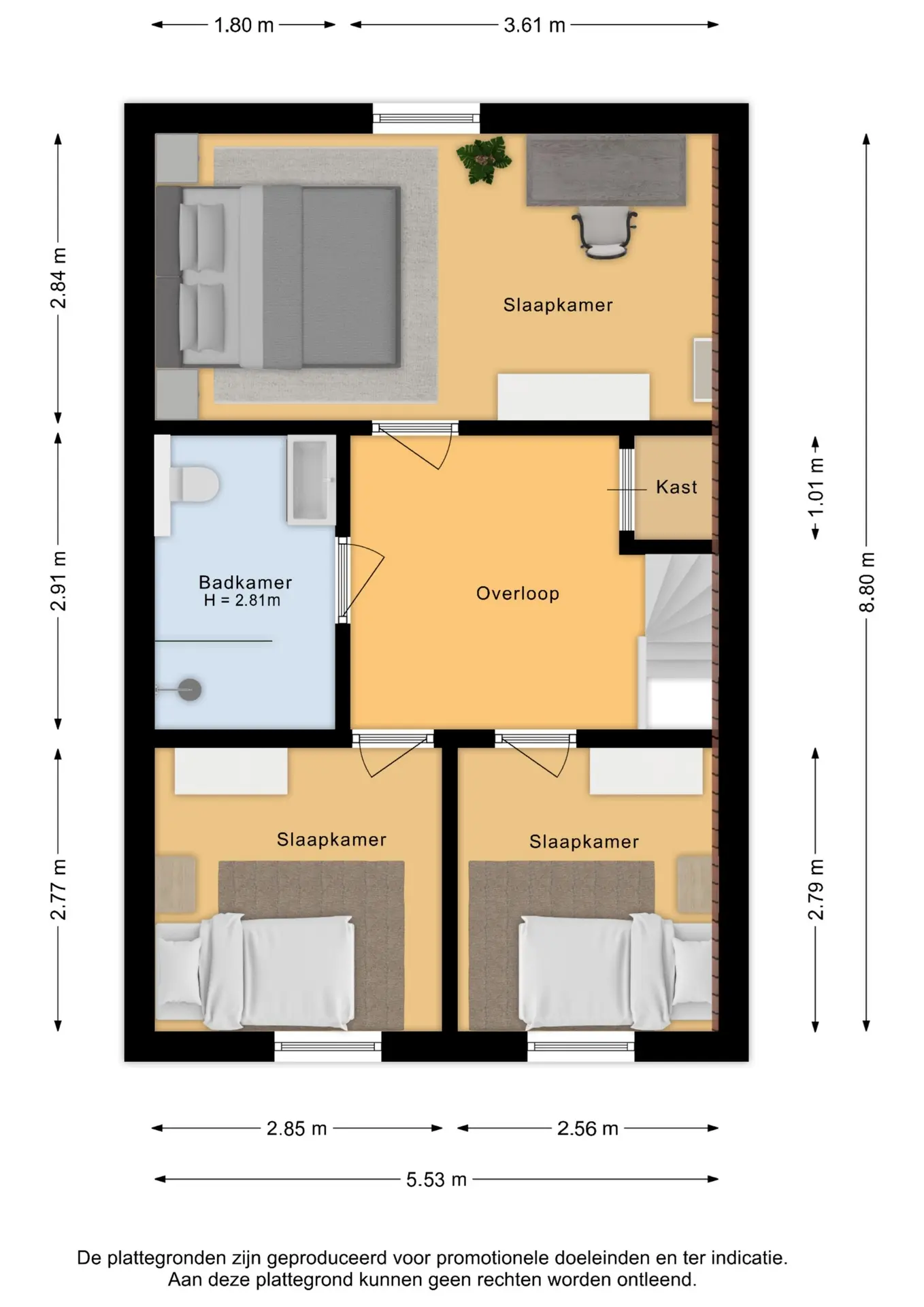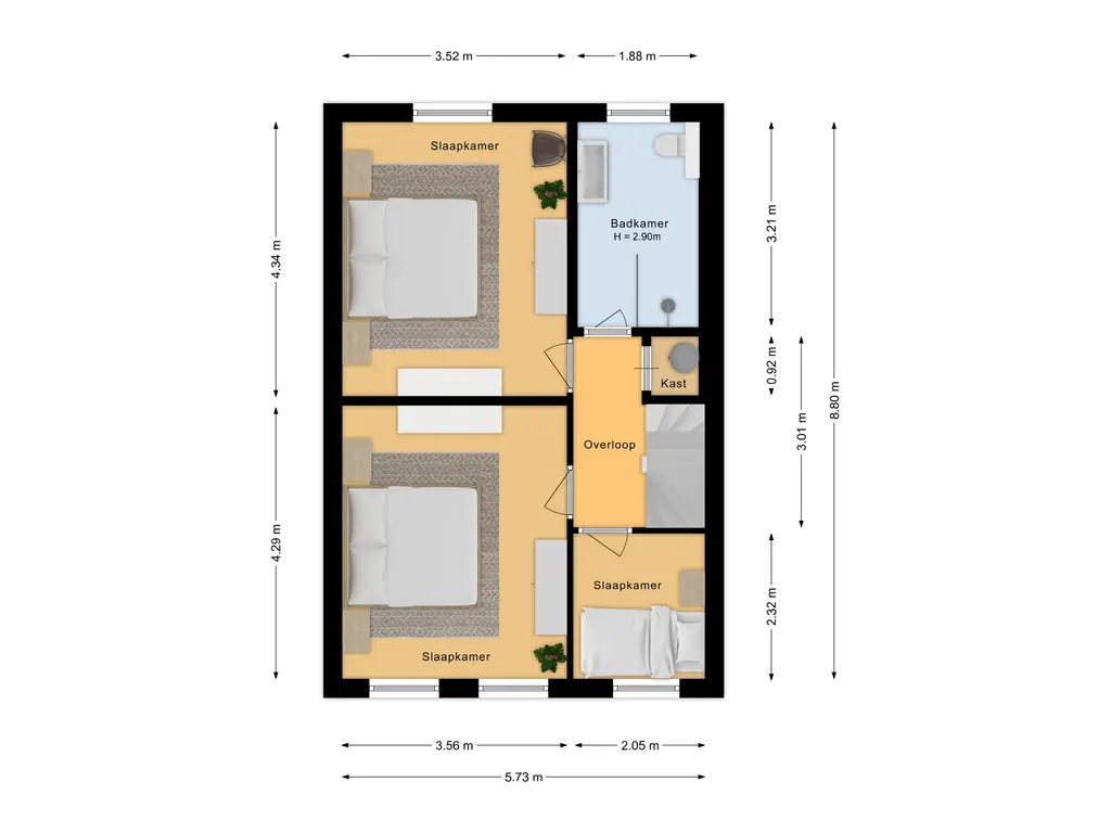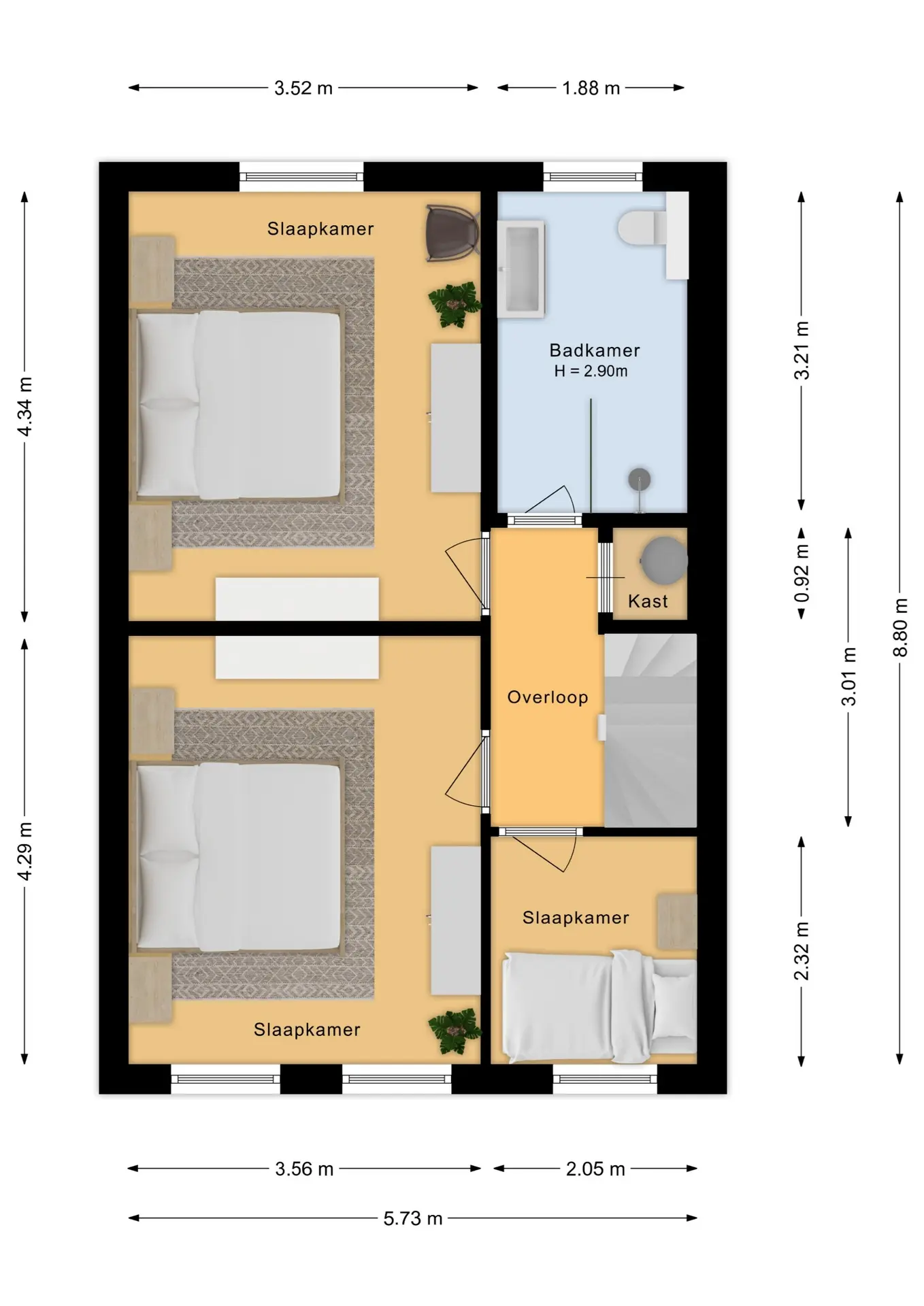 Overloop, bergkast met opstelling van de elektrische boiler. Er zijn twee royale slaapkamers en een voormalige slaapkamer voorzien van de witgoedaansluiting. Deze kamer is prima geschikt om te gebruiken als ‘waskamer’. De moderne badkamer is uitgevoerd met een toilet, inloopdouche en wastafelmeubel.