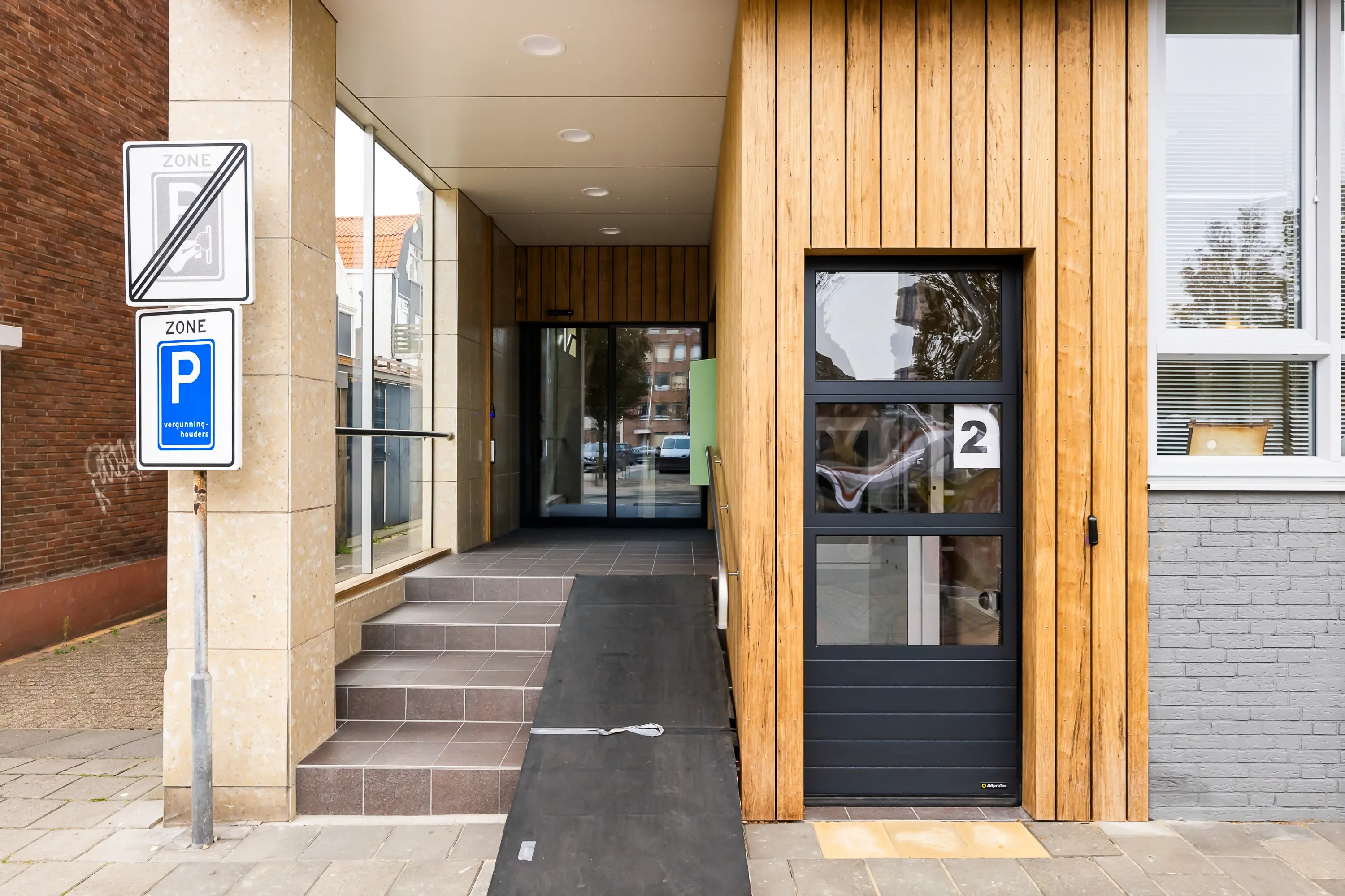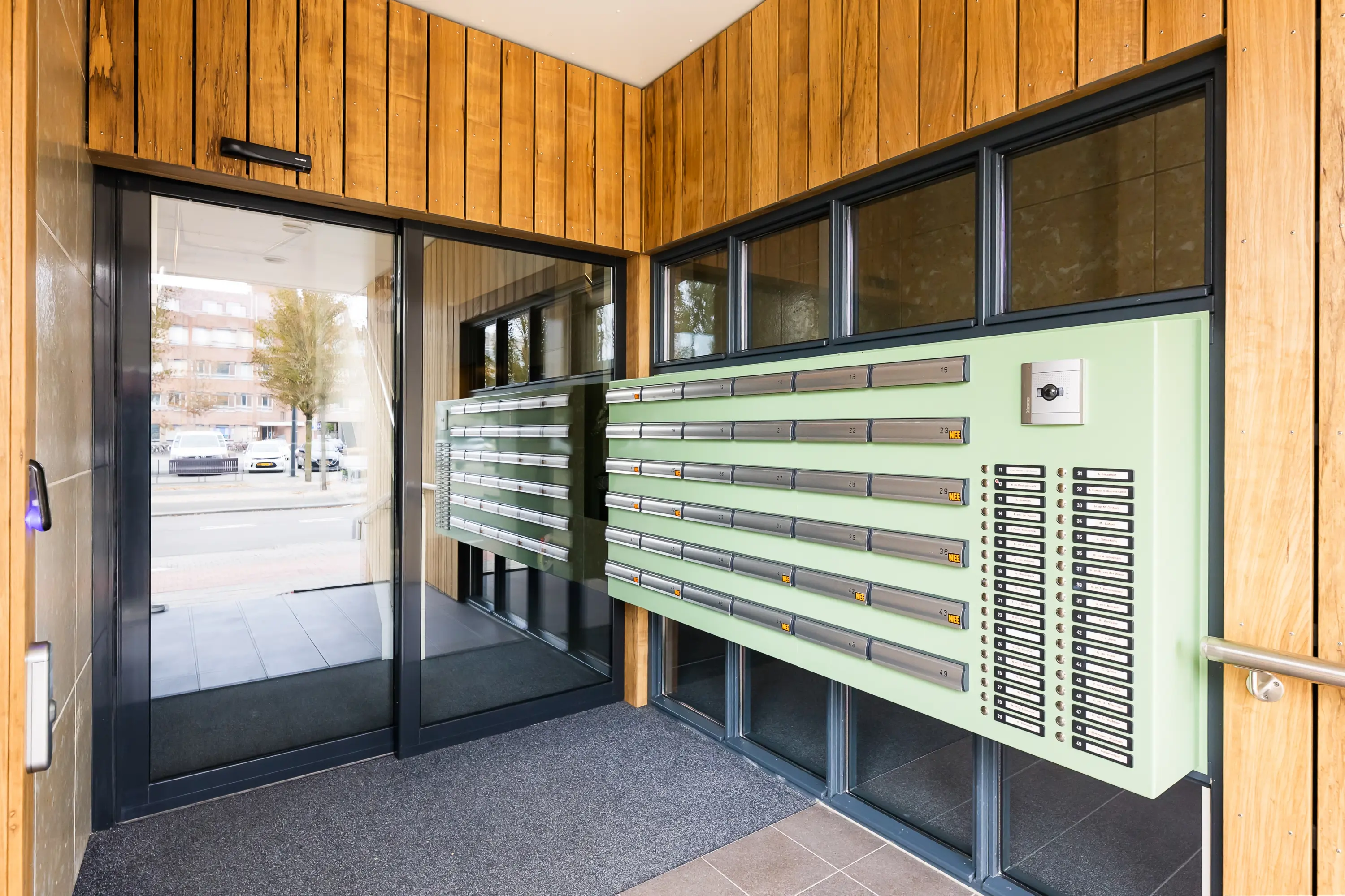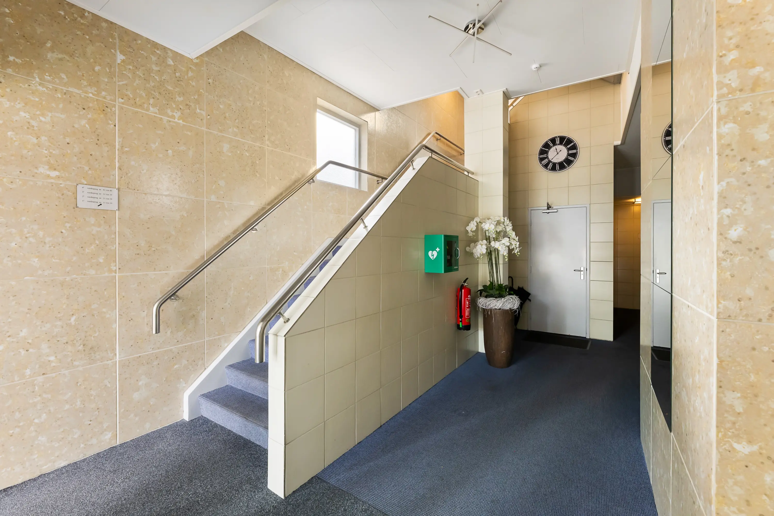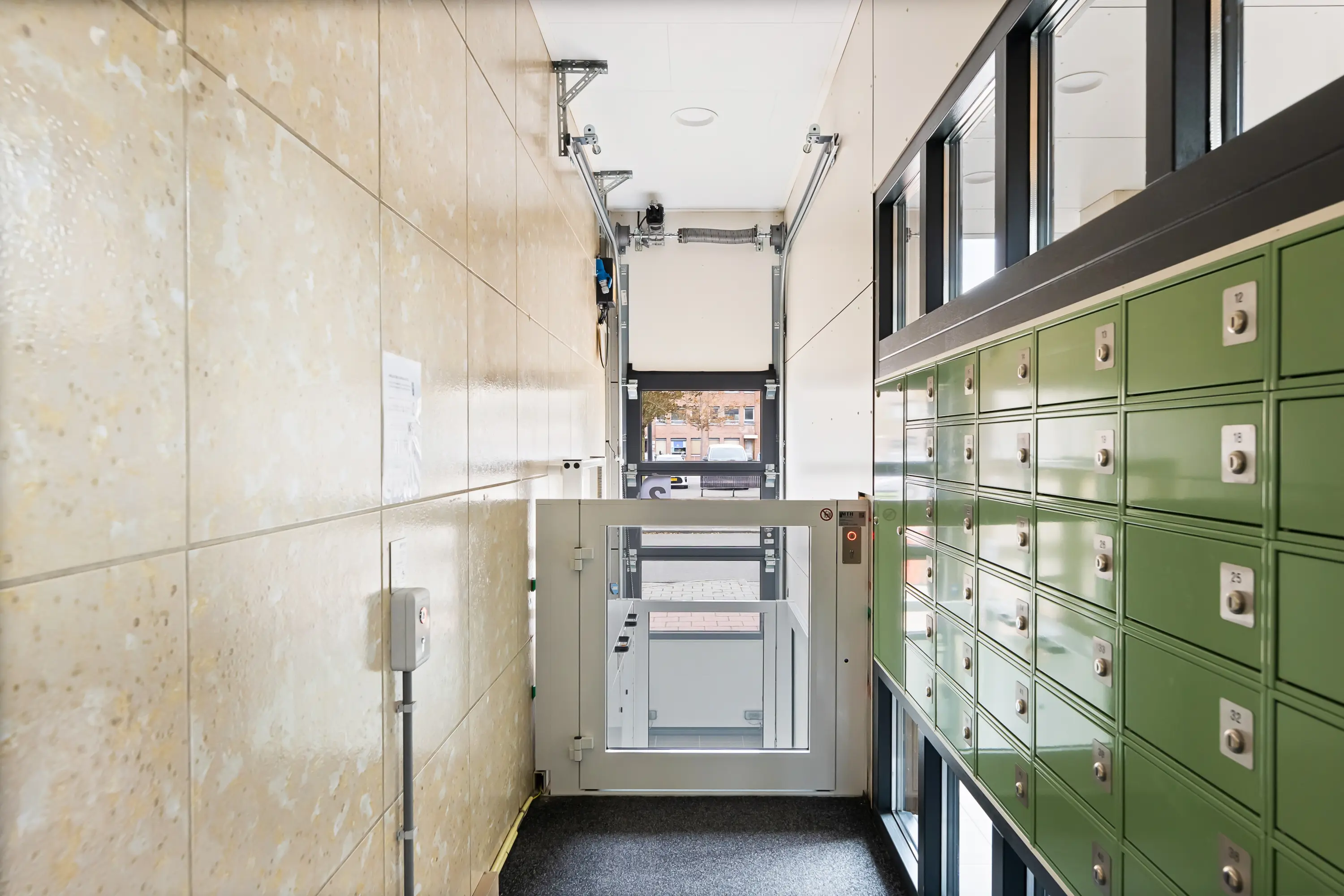 Er is een nette recent vernieuwde entree, beveiligd door een intercom. Vanuit de entree zijn de lift en de (fietsen)bergingen in de onderbouw te bereiken.